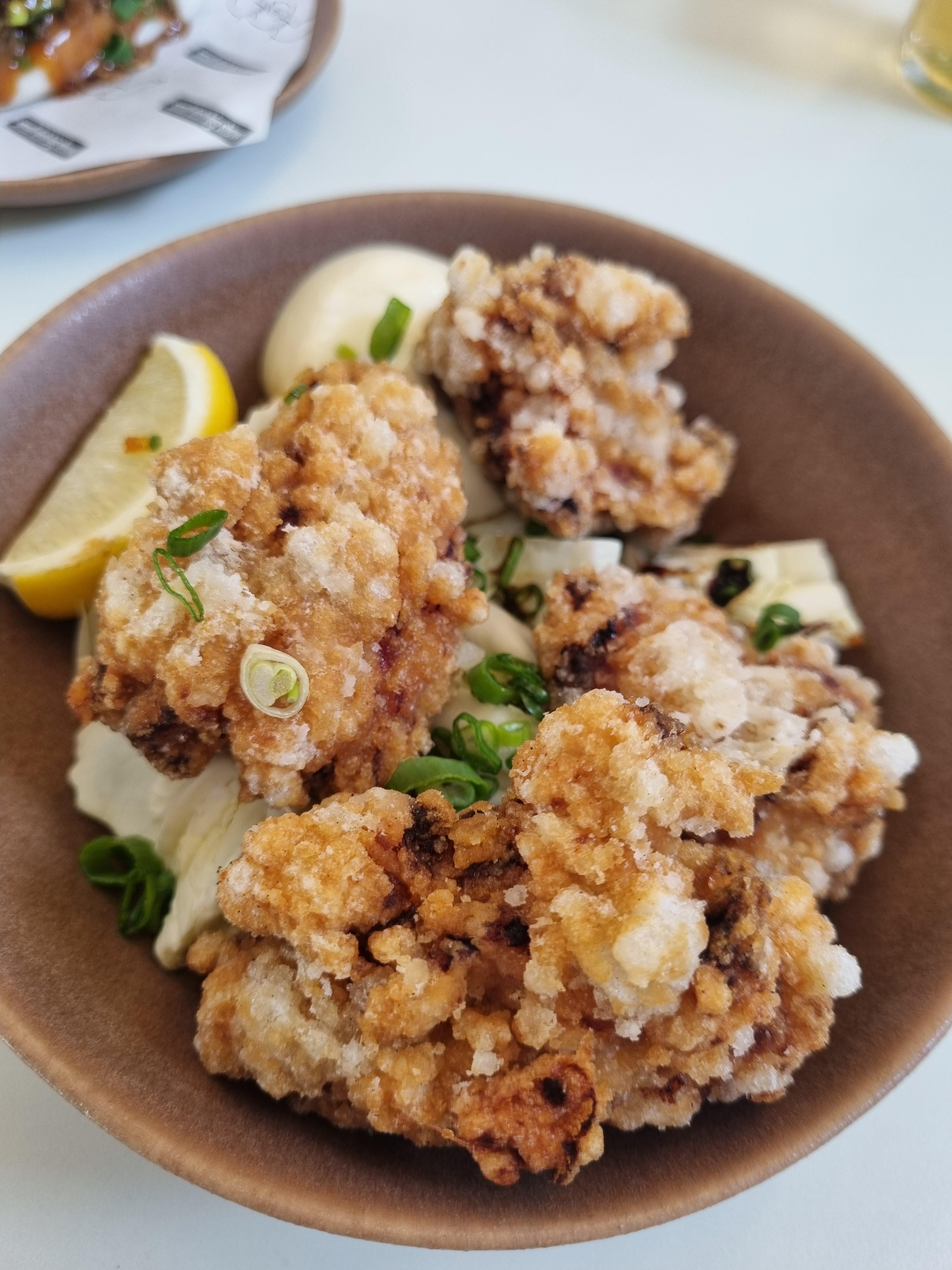좀 큼지막하게 조각 낸 닭으로 가라아게를 만들었다. 저렇게 나온게 크게 3조각정도. 작게 나눠진 가라아게가 아니다. 거기에다가 아래에는 양배추를 깔았고, 유자마요소스를 같이 준다. 근데 굳이 마요네즈를? 싶은 느낌이긴했다. 그냥 먹을때가 더 맛있고 마요찍으면 좀 느끼했다.