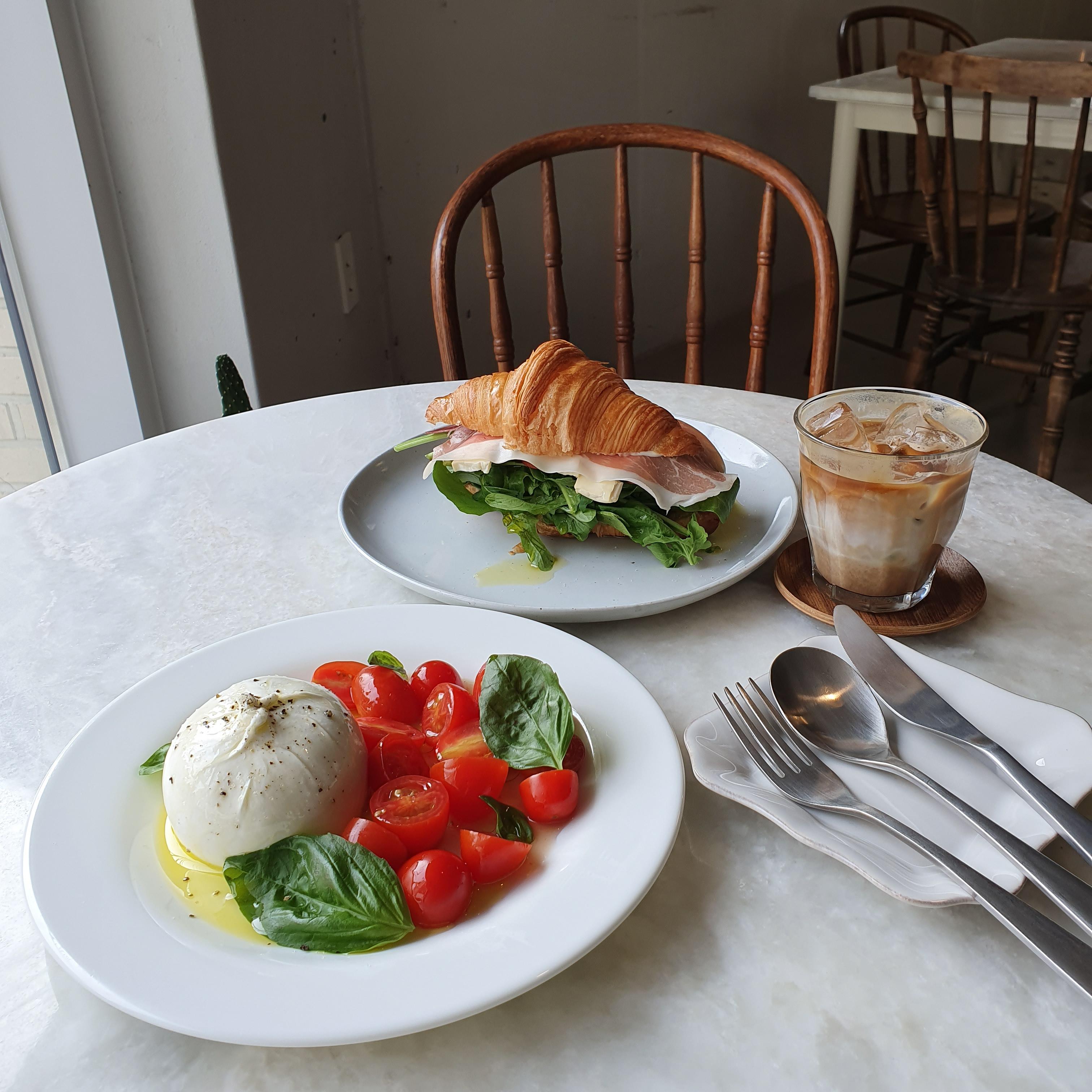 깨끗한 대리석 테이블에 앉았다. 이날은 배가 고프기도 하고, 간 김에 먹자는 욕심에 꼭 먹어보고 싶었던 노르망디 샌드위치와 부라타샐러드를 주문했다.