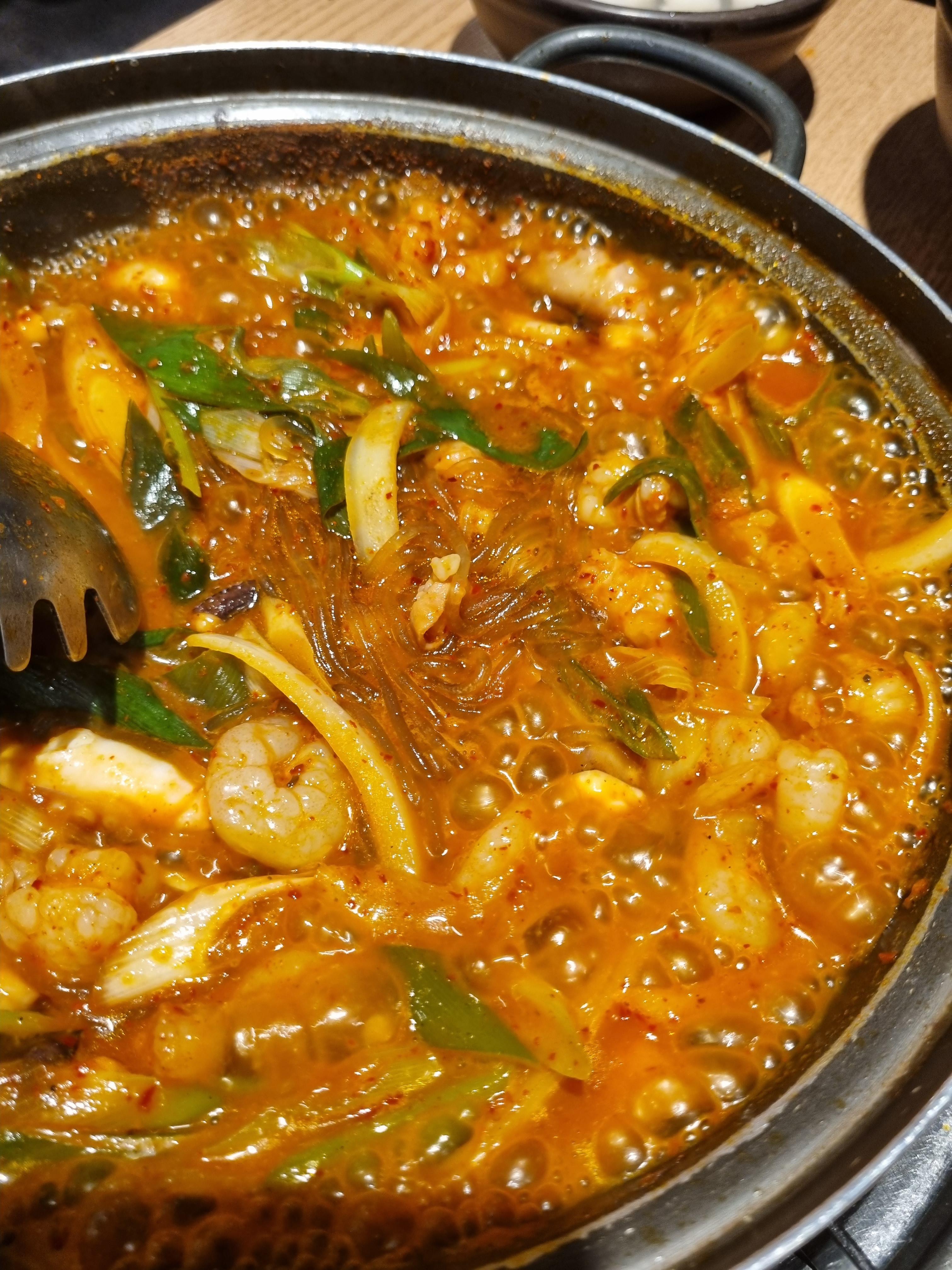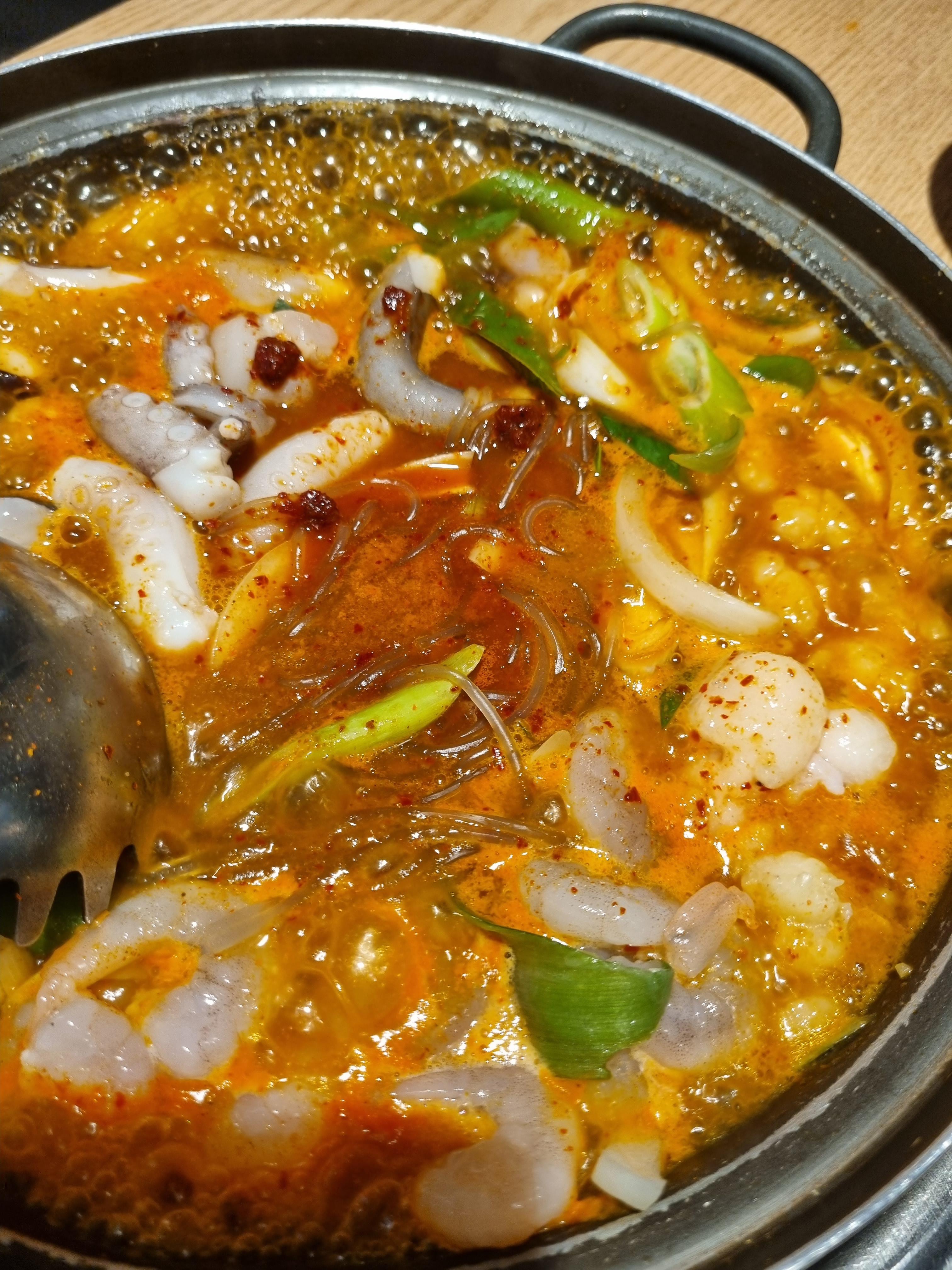 낙지와 곱창, 새우가 어우러진 낙곱새. 이렇게 빨리 끓여서 곱창이 부드러울까 걱정했는데 걱정은 뭐하러 했나 싶다. 이걸 이렇게 점심으로 빠르게 먹는 이유가 있겠지. 바로 잘 끓여져서 부드러워졌다.
