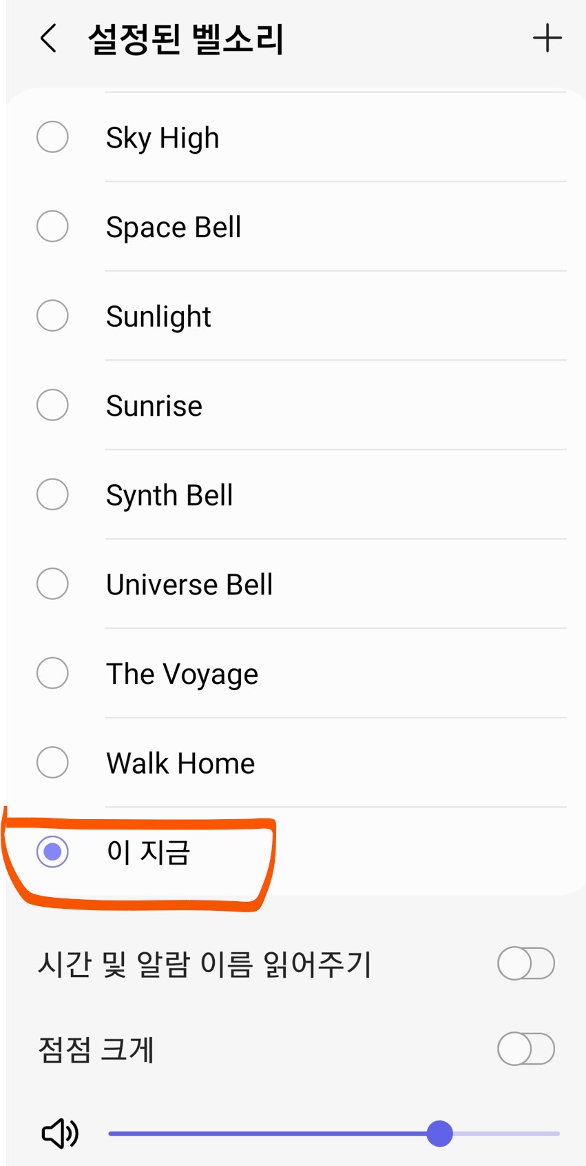 11. 맨 아래 스피커 모양에서 알람의 볼륨을 설정할 수 있다. 아주 크게 하거나 조금 작게 조절도 가능.