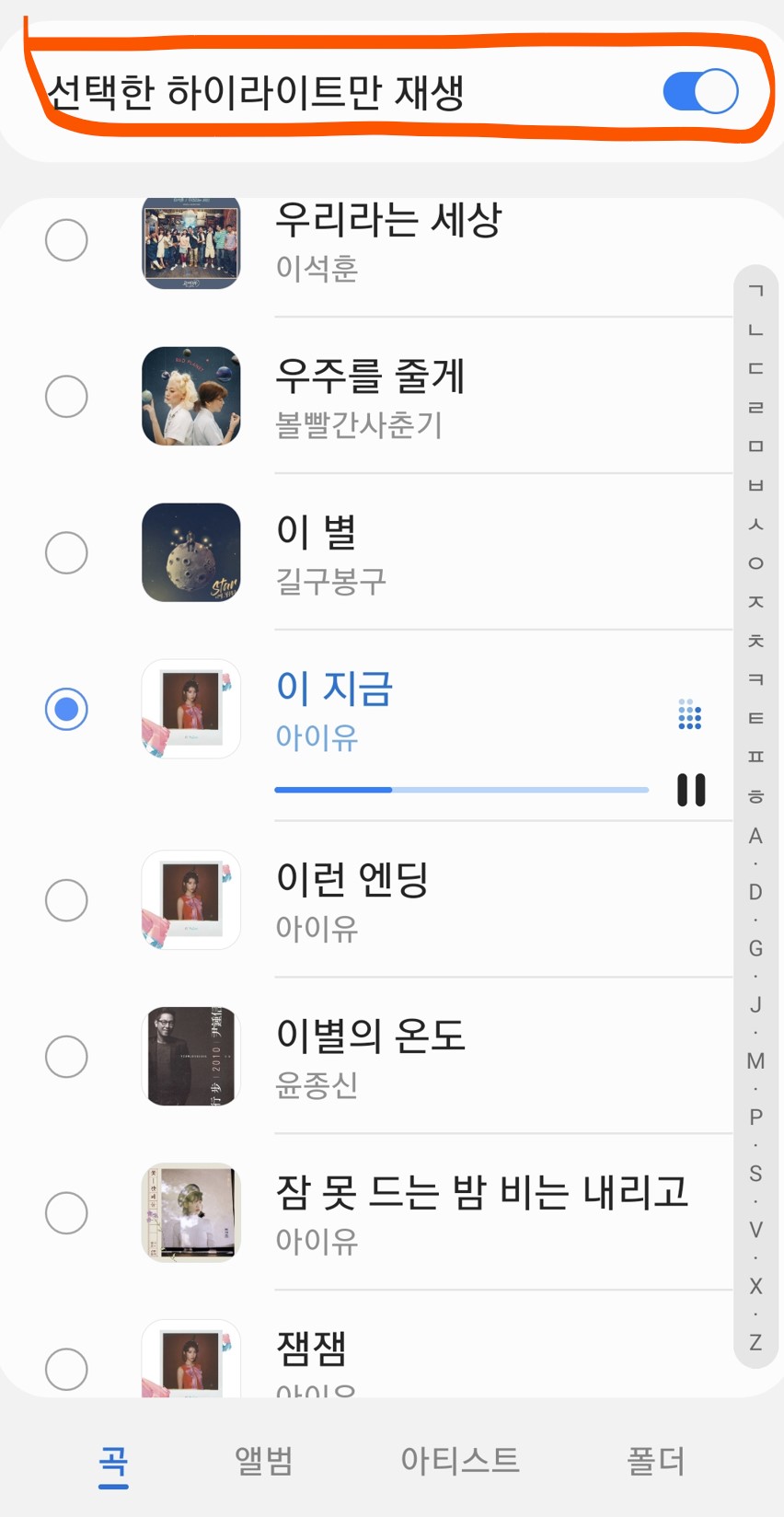 6. 기본적으로는 '선택한 하이라트만 재생'으로 선택된다.