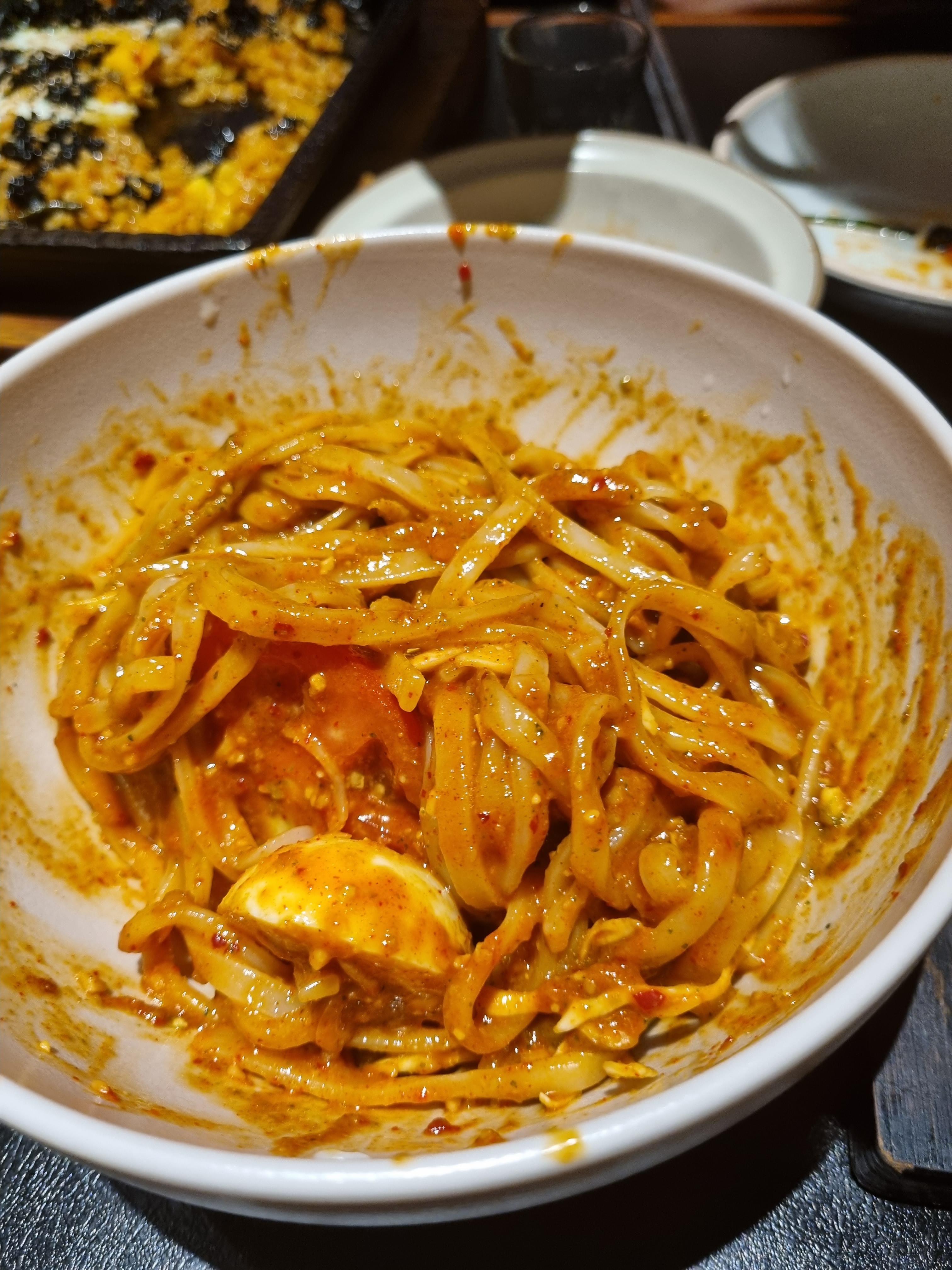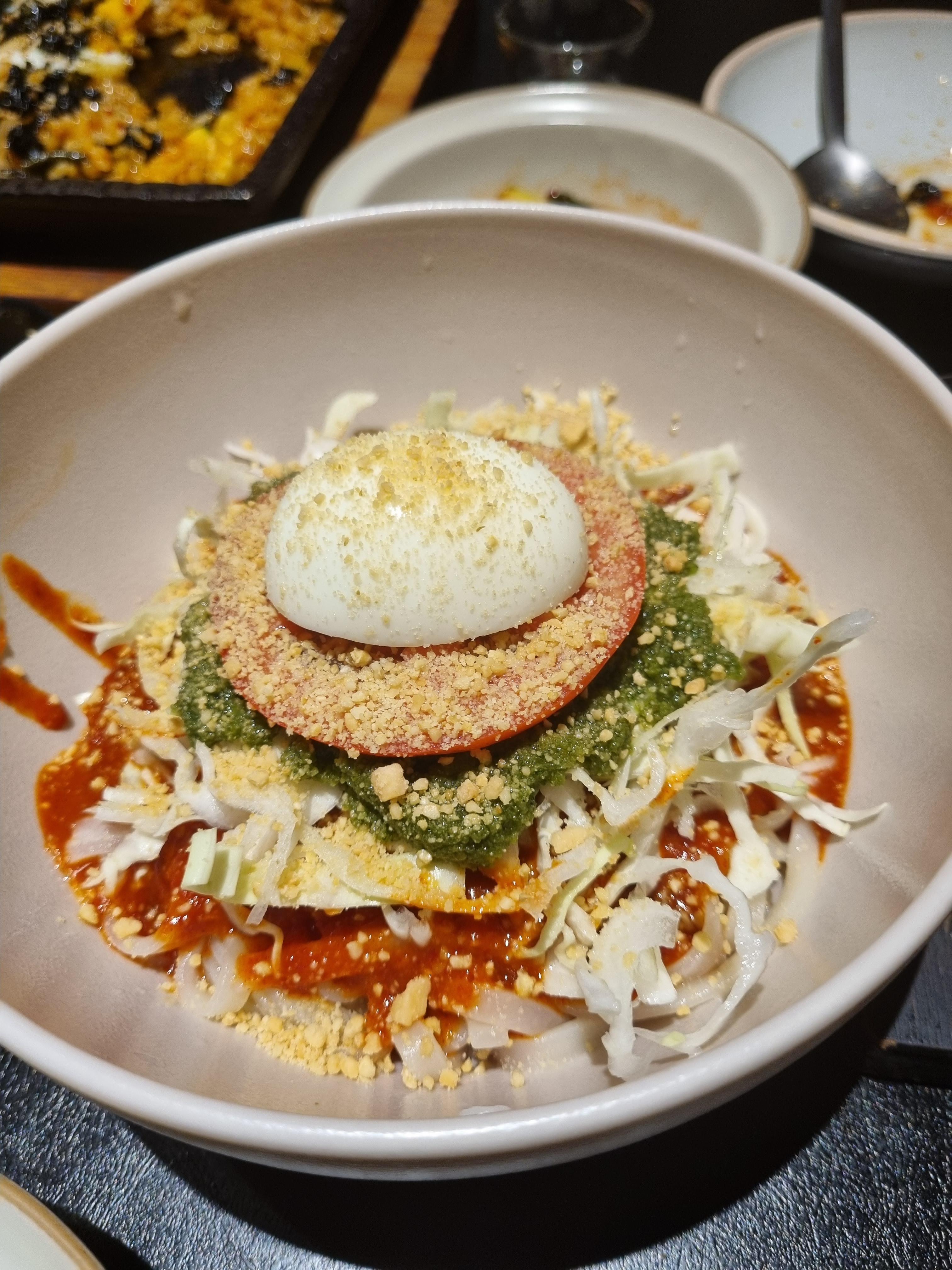 차가운 칼국수면인데 쫄면처럼 쫄깃한 맛. 좀 퓨전 느낌이 강하다.