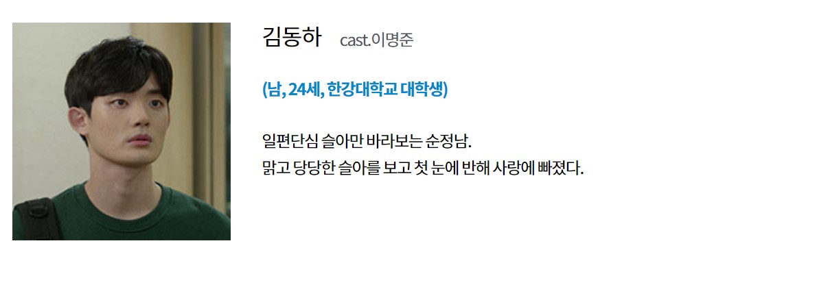슬아를 좋아하는 슬아의 대학교 동창. 슬아가 아들이 있어도 상관없이 좋아하는 직진남이다.