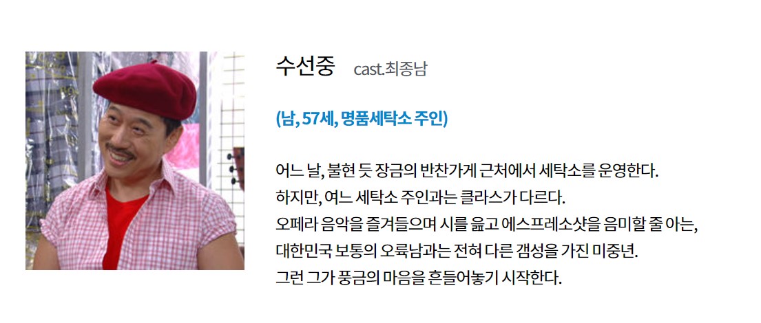 30년동안 반찬가게를 운영하고 있는 초희의 엄마. 알고보니 방배수회장과 어릴적 오빠동생 하는 사이였다고 한다.