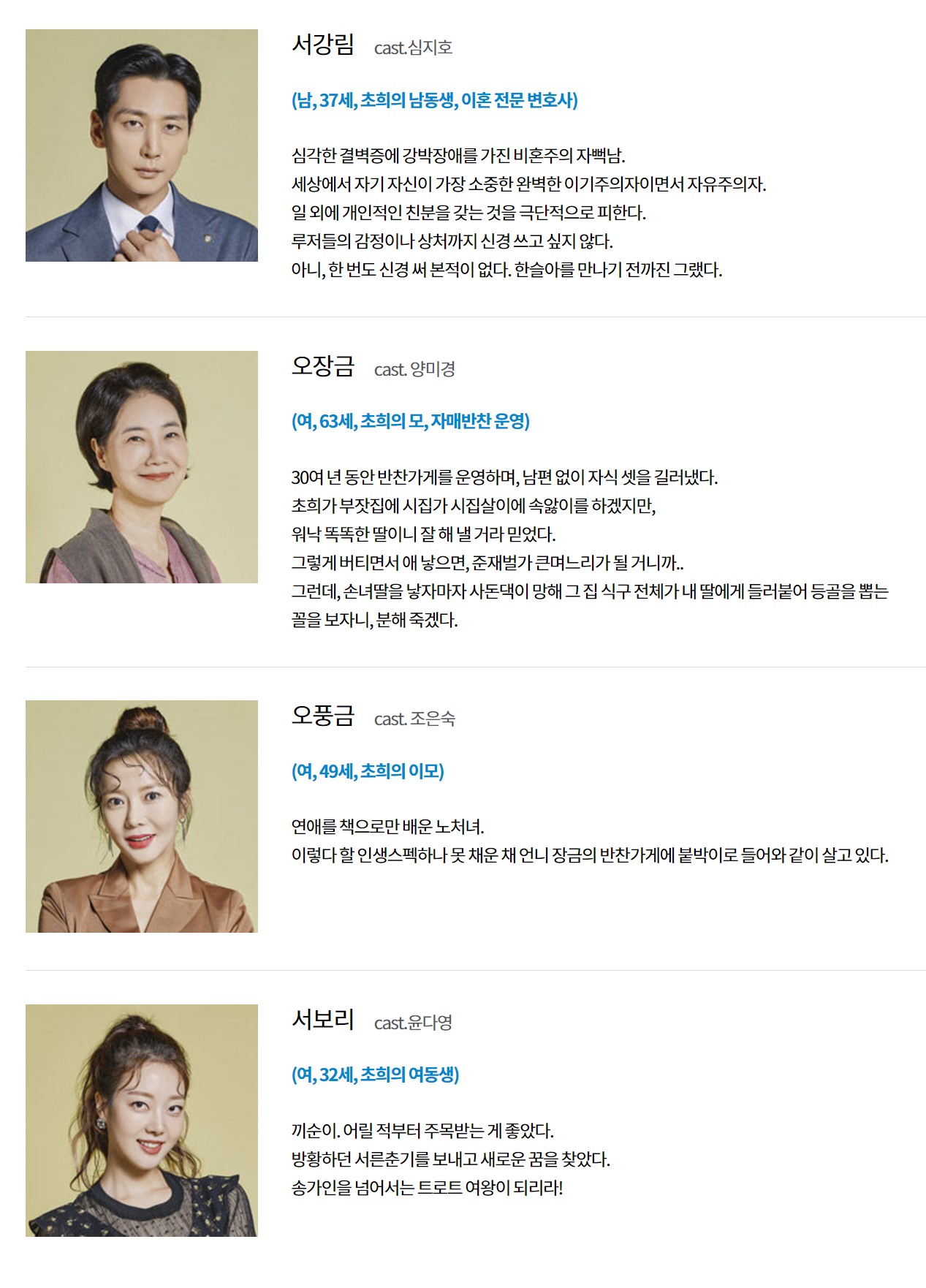 초희의 막내동생. 트로트가수를 한다고 하다가 최근에는 작가로 데뷔했다. 초희의 사무실 본부장과 엘리베이터 사건 등으로 엮이면서 둘이 사귀게 된다. 하지만 본부장의 엄마가 둘이 사귀기만 하고 결혼은 생각지도 말라는 말에 엄청 상처받고, 검정고시를 준비중이다.
