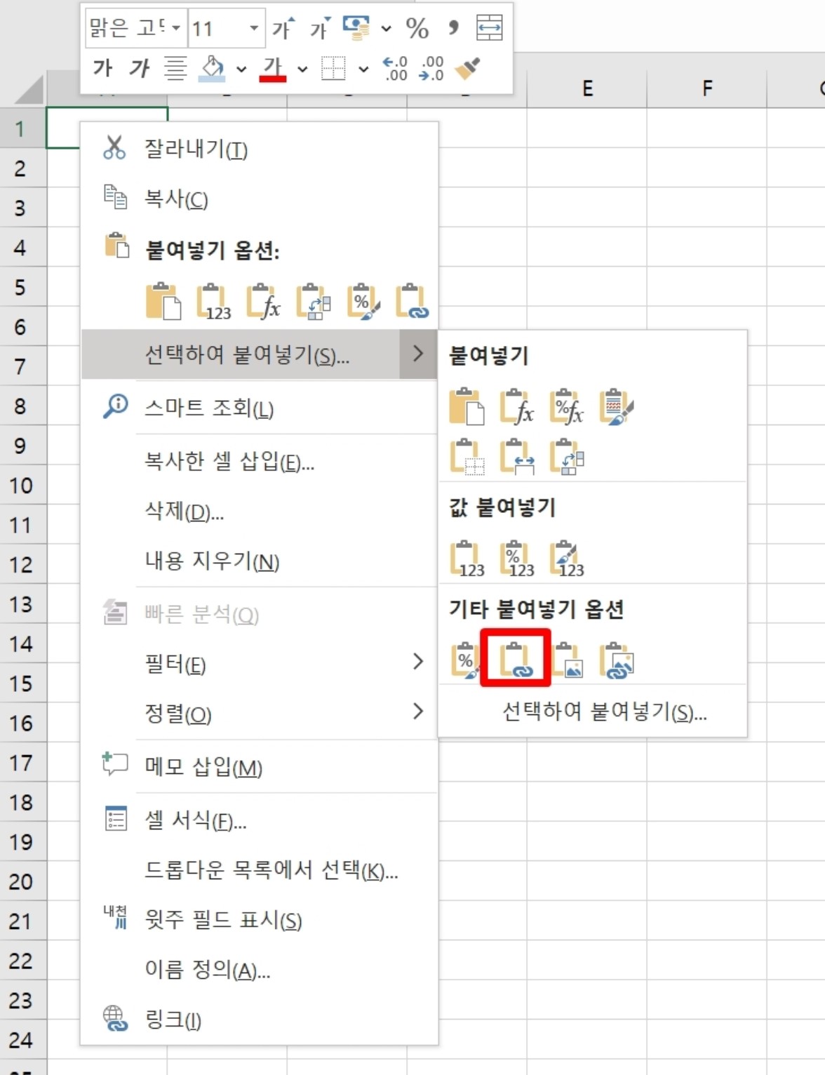 기타 붙여넣기 옵션은 총 4가직 있다. 그 중에서 그림으로 연결하여 붙여넣기에 대해 먼저 자세하게 살펴보고 추가적으로 나머지 기능도 같이 살펴보려고 한다.
