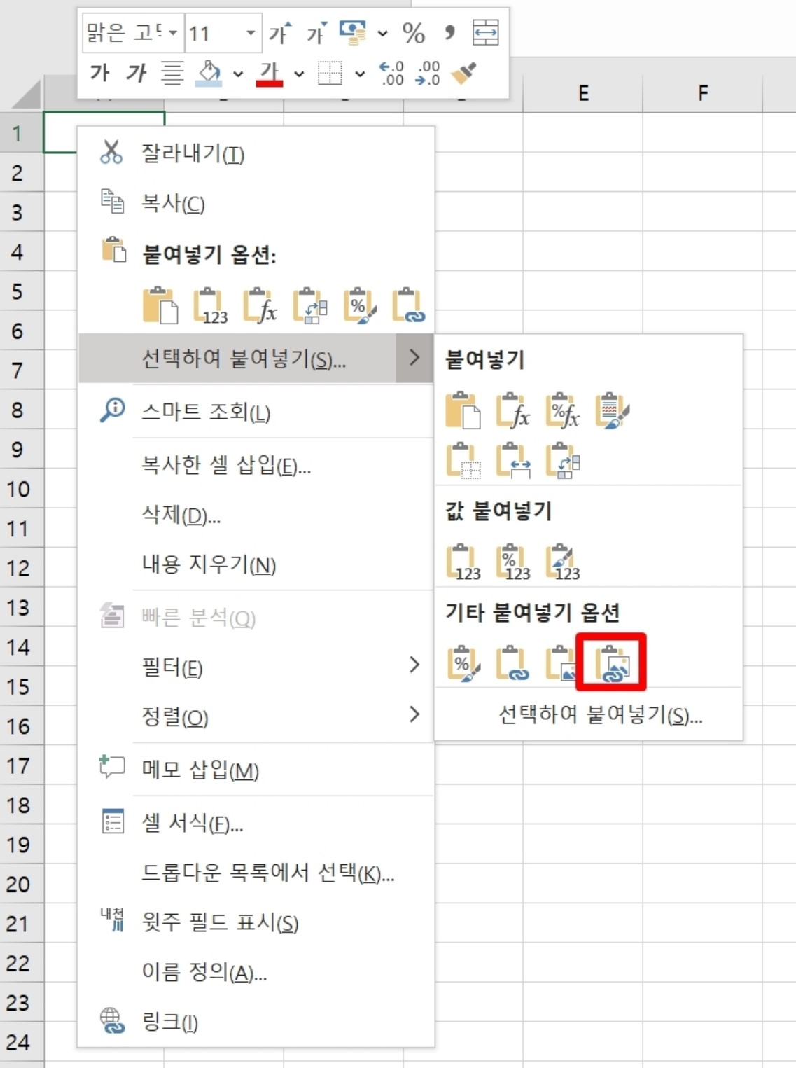 기타 붙여넣기 옵션은 총 4가직 있다. 그 중에서 그림으로 연결하여 붙여넣기에 대해 먼저 자세하게 살펴보고 추가적으로 나머지 기능도 같이 살펴보려고 한다.