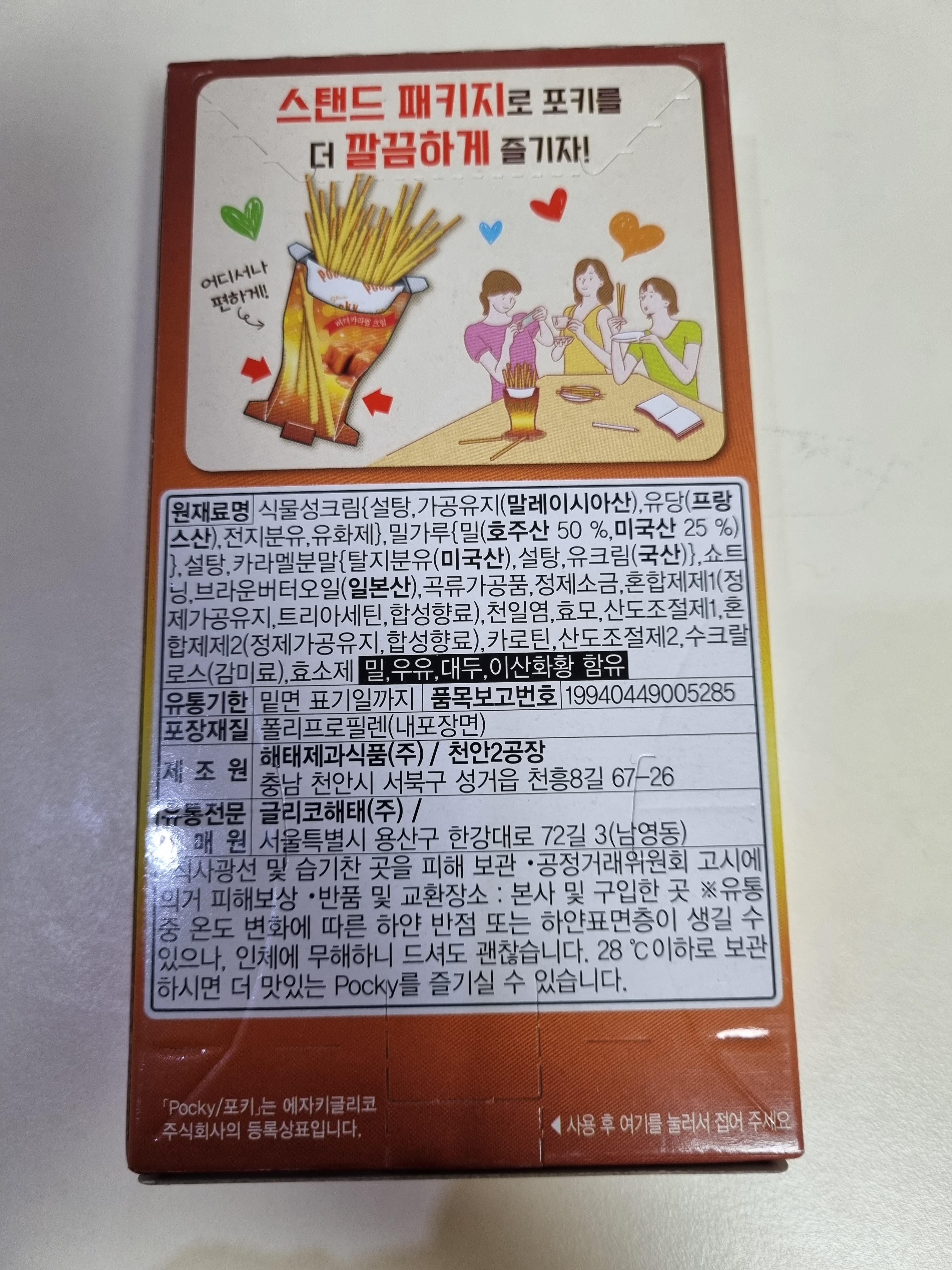 일단 겉 포장이 카라멜이 가득할 것 같은 느낌이다. 카라멜그림이 눈길을 사로잡았다. 포키는 스탠드형으로 박스를 세워서 먹을 수 있다는데 시도해보진 않았다. 숫자로 1번부터 어떻게 하는지 나와있으니 참고해서 스탠드형으로 세워서 먹고싶다면 도전해 볼 것.