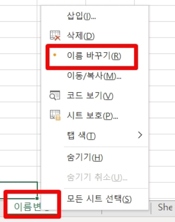 1. 워크시트명 위에서 마우스 오른쪽 버튼을 클릭하고, 이름바꾸기를 선택한다.