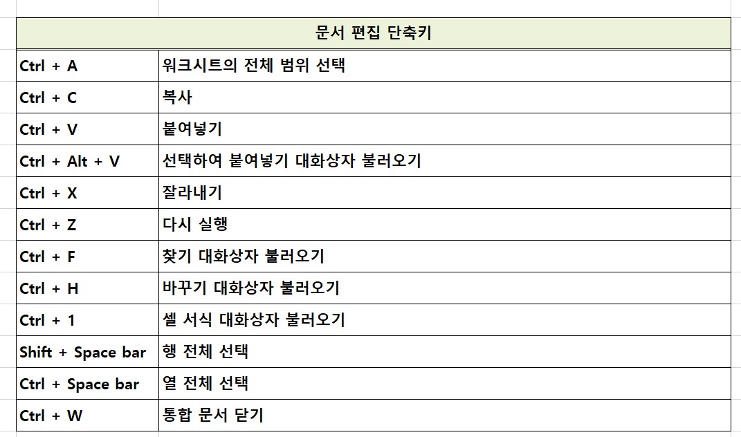특히, 문서관리 단축키와 문서 편집 단축키는 필수로 알아두는게 좋다. 엑셀말고 다른 곳에서도 활용이 가능하기 때문이다.