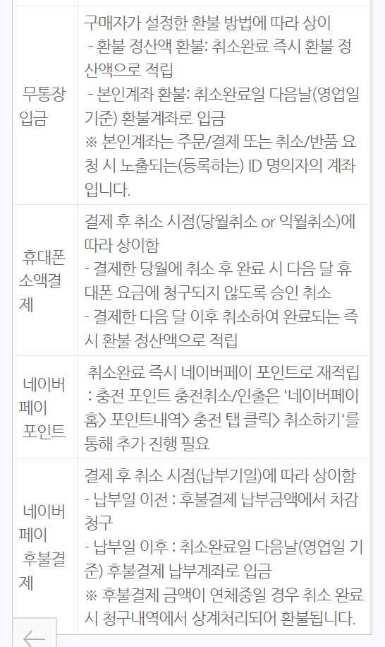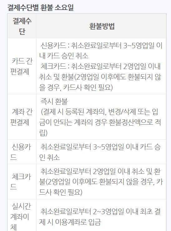 아래에 결제수단별 환불 소요일을 첨부하니 참고하자.