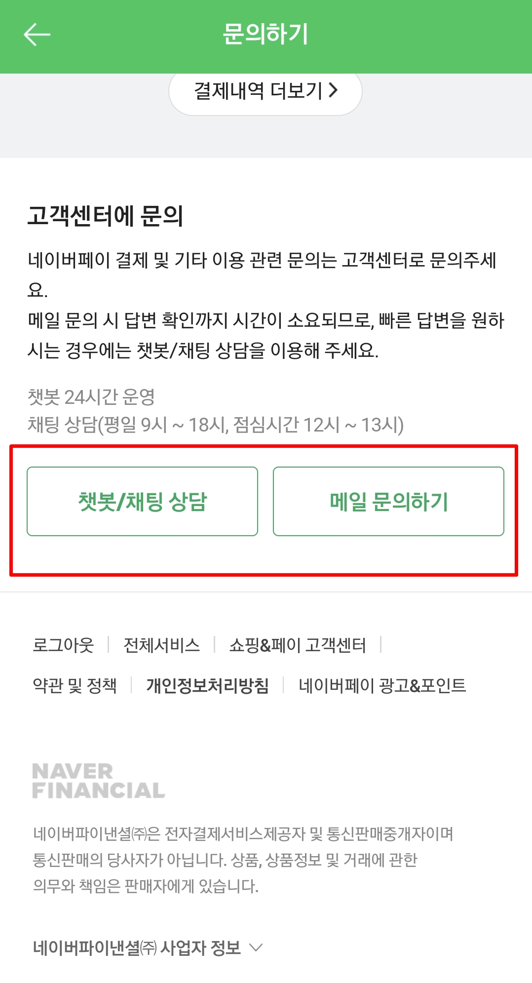 챗봇상담이나 이메일상담을 찾는것도 쉽진않다. 네이버는 직접 고객상담을 안하기 위해 엄청 꽁꽁 숨겨놓았다.