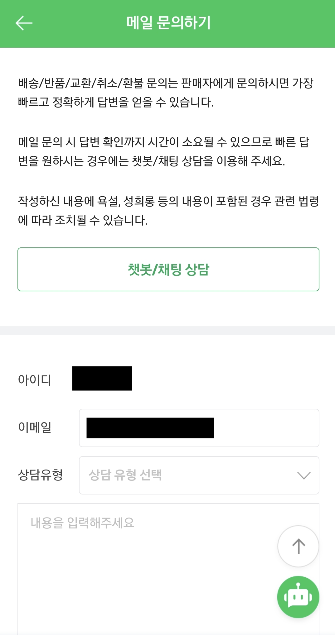 챗봇채팅 또는 이메일 상담 하는 방법