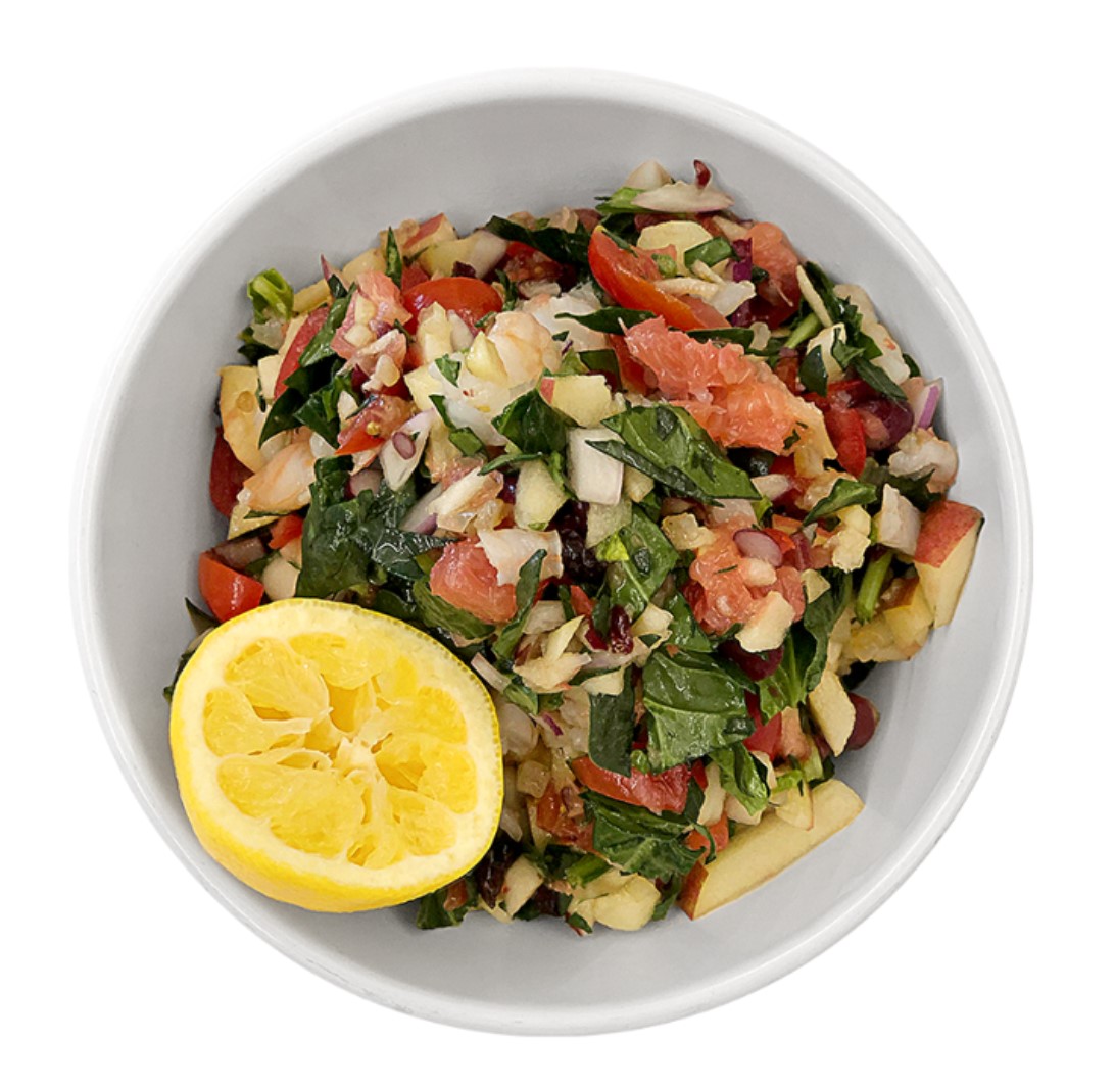 버진올리브유+소금+후추+레몬즙의 소스에 시금치, 사과, 콩, 레드어니언, 체리토마토, 구운새우, 자몽, 건 크랜베이, 레몬껍질을 넣었다.