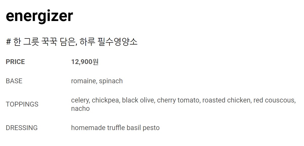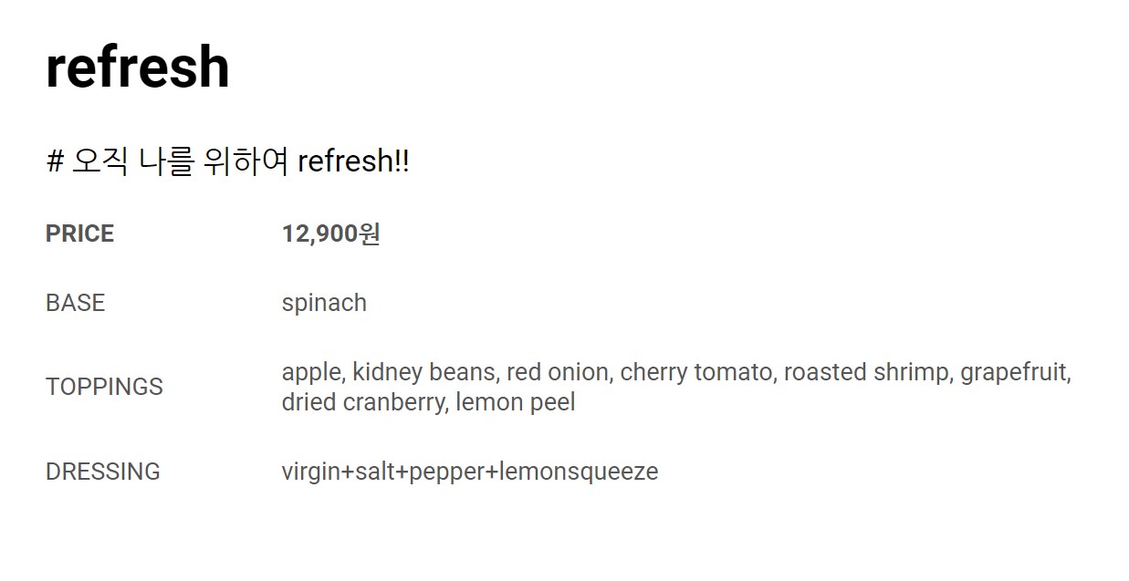 메뉴는 자세한게 좋으니까, 샐러드메뉴는 하나하나 자세하게 찍어봤다.