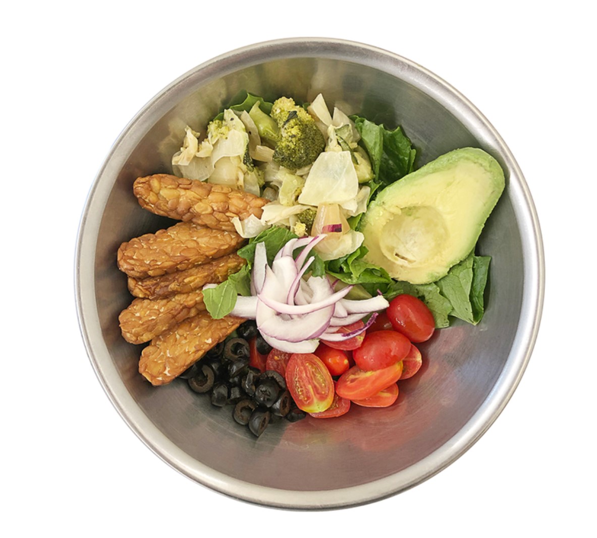 갈릭시트러스 소스에 로메인, 치커리, 체리토마토, 블랙올리브, 레드 어니언, 로스티드 베이터블 믹스, 아보카도, 로스티드 템페를 넣었다.