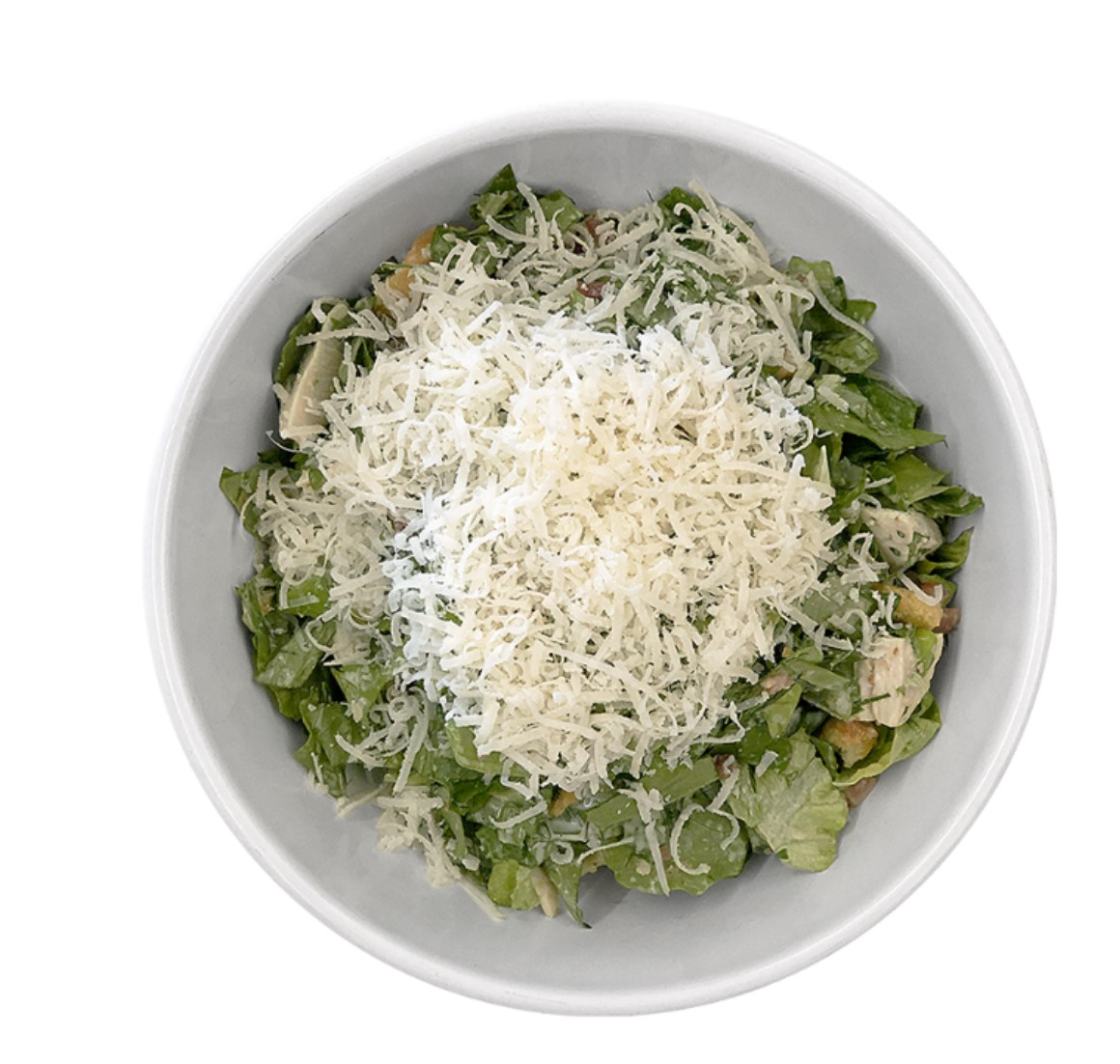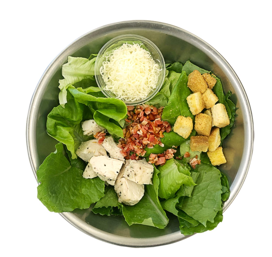 홈메이드 시저소스에 로메인, 구운치킨, 양상추, 그라파다노 치즈, 베이컨칩, 핸드메이크 크루통을 넣었다.