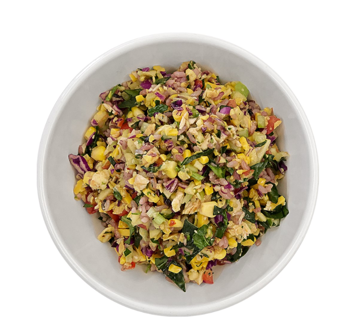 사과 비네거 소스에 시금치, 레드 양배추, 체리토마토, 사과, 옥수수콘, 셀러리, 체다치즈, 스파이시치킨, 멀티곡물 라이스, 그리스피 갈릭 칩을 넣었다.