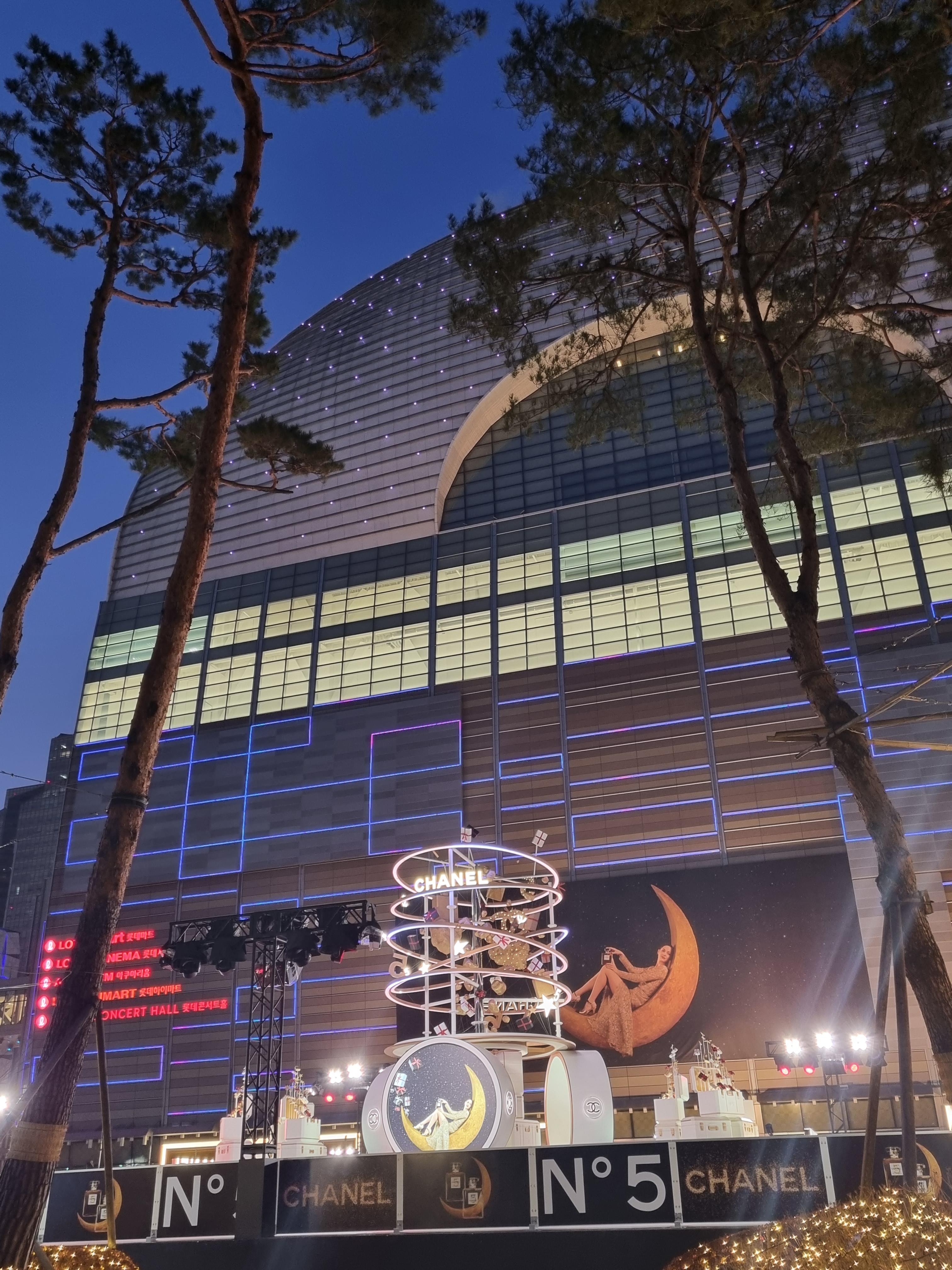 롯데타워 사이에 큰 트리가 있고, 그 사이를 지나가면 뒤에 샤넬이 딱 보인다.