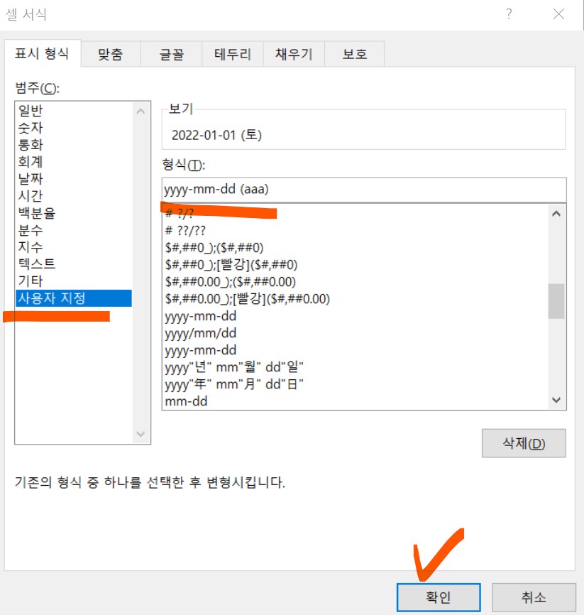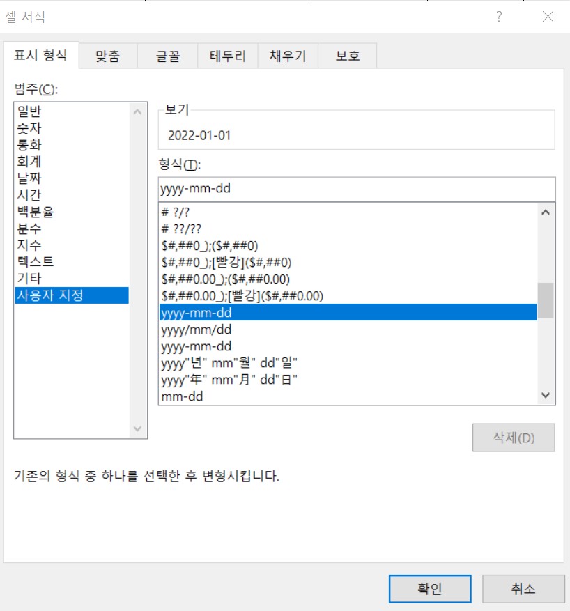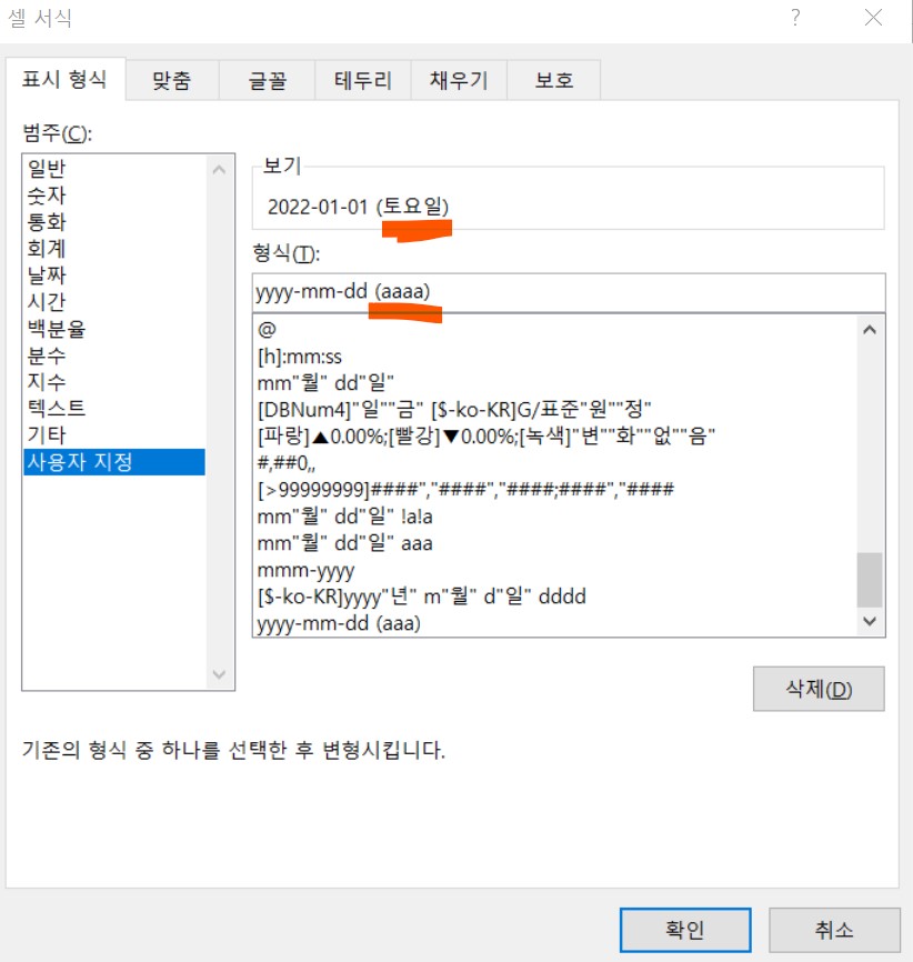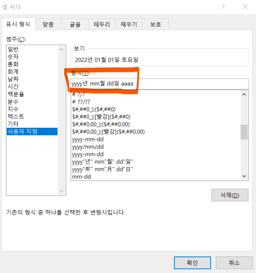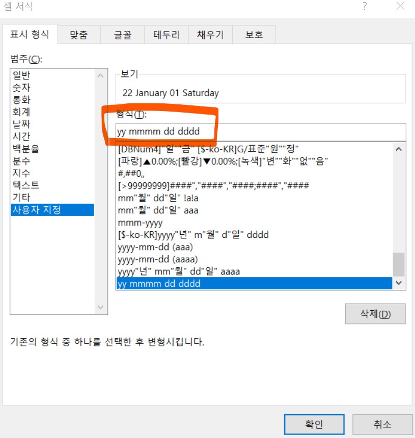 사용자 지정 형식에 들어가보면, 기본적으로 입력되는 날짜의 서식 코드를 볼 수 있다.