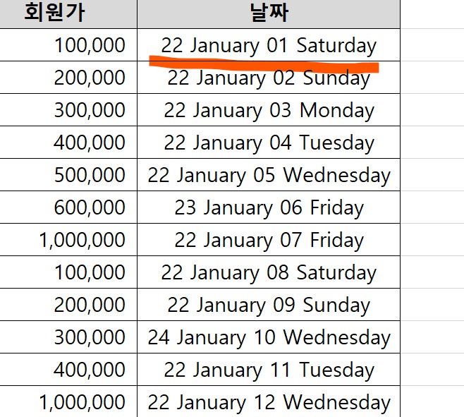 한 셀에 아주 길게 표시가 되지만, 그래도 누가 봐도 이해하기 쉬운 날짜로 표시되었다.