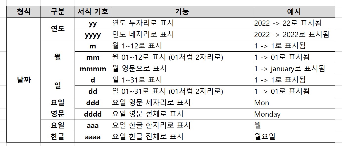yy : 연도를 2자리로 표시 (2022입력시 22로 표시됨)