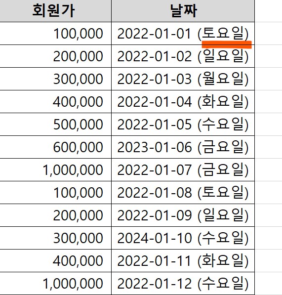 기본적으로 날짜를 입력하면, 연도-월-요일 순서로 입력된다.