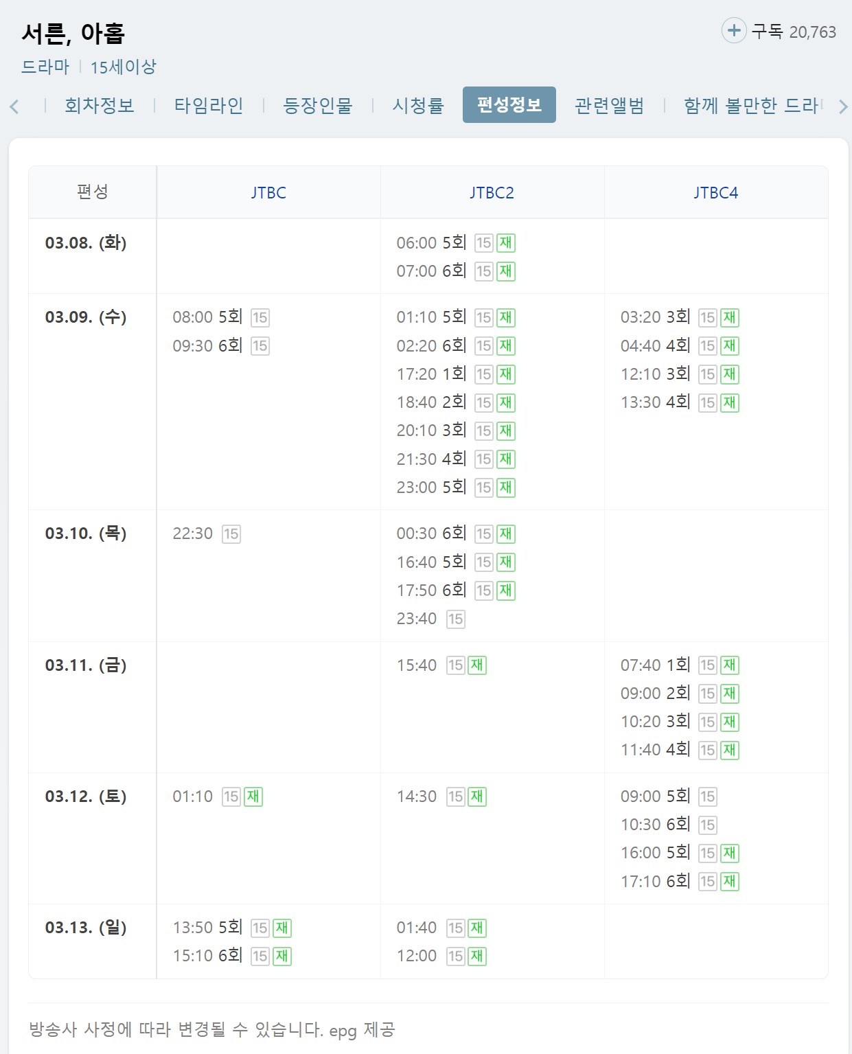 시간별로 편성표를 첨부했으니 참고하시길!!! 각각 회차마다 방영되는 시간이 다르다.
