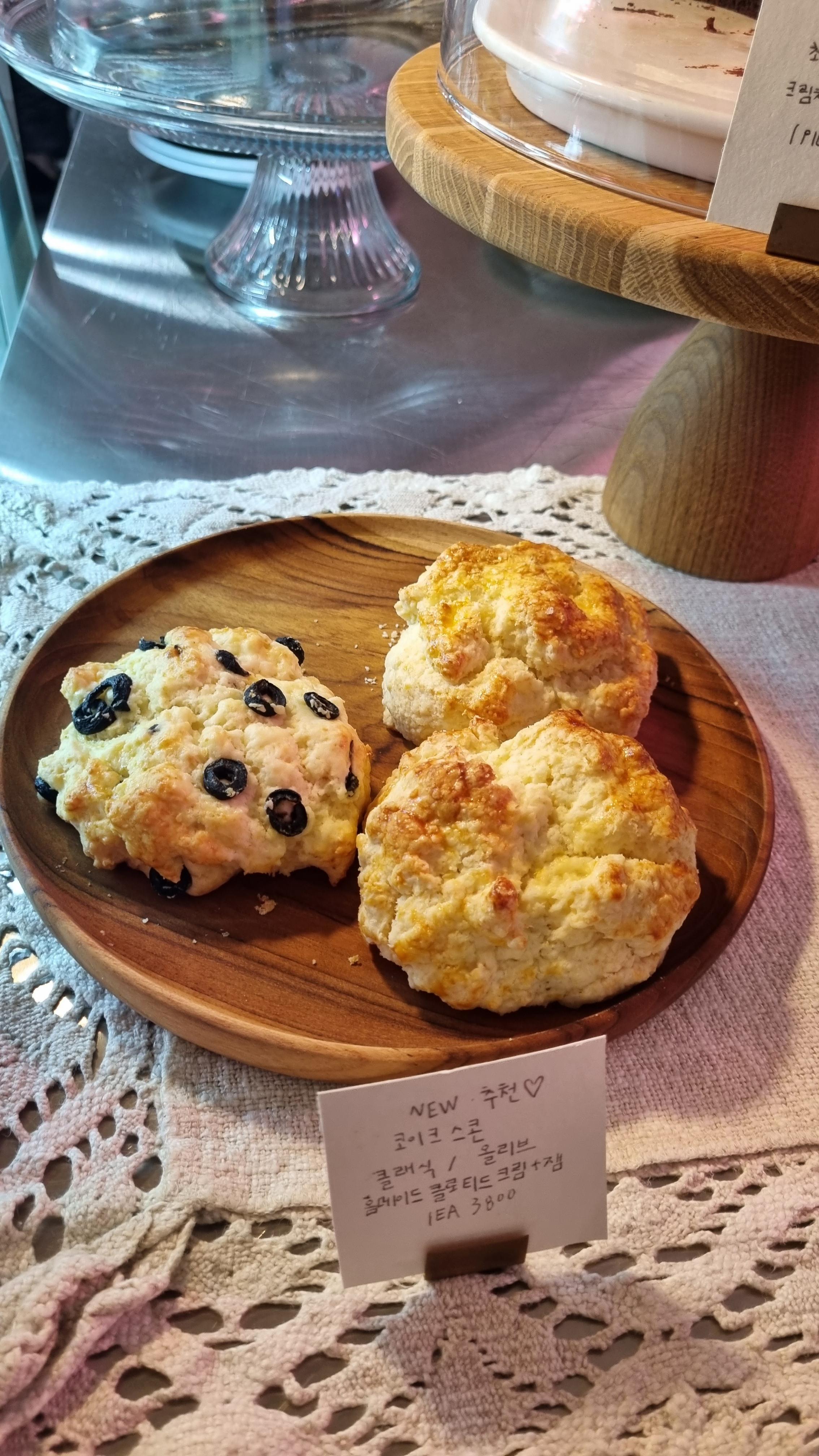 스콘 맛은 클래식과 올리브맛이 있고, 주문하면 홈메이드 클로티드크림과 잼을 제공하는 것 같다.
