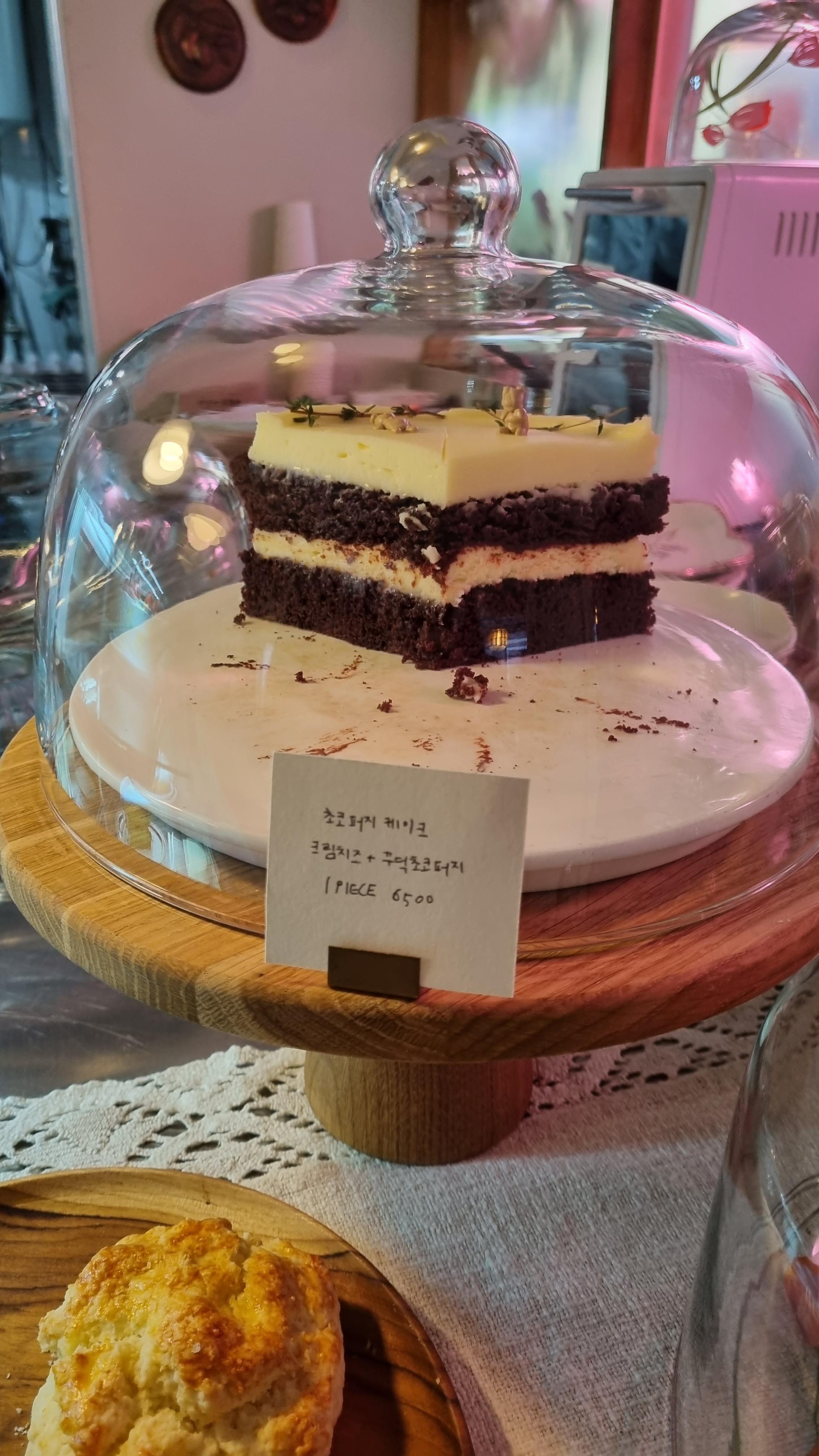 같이 준비된 또 다른 케이크. 크림치즈와 꾸덕한 초코퍼지 맛이라고 한다. 이외에도 치즈케이크와 그날마다 준비되는 케이크가 있다. 그 케이크들은 옆에 쇼케이스 냉장고에 준비되어 있다.