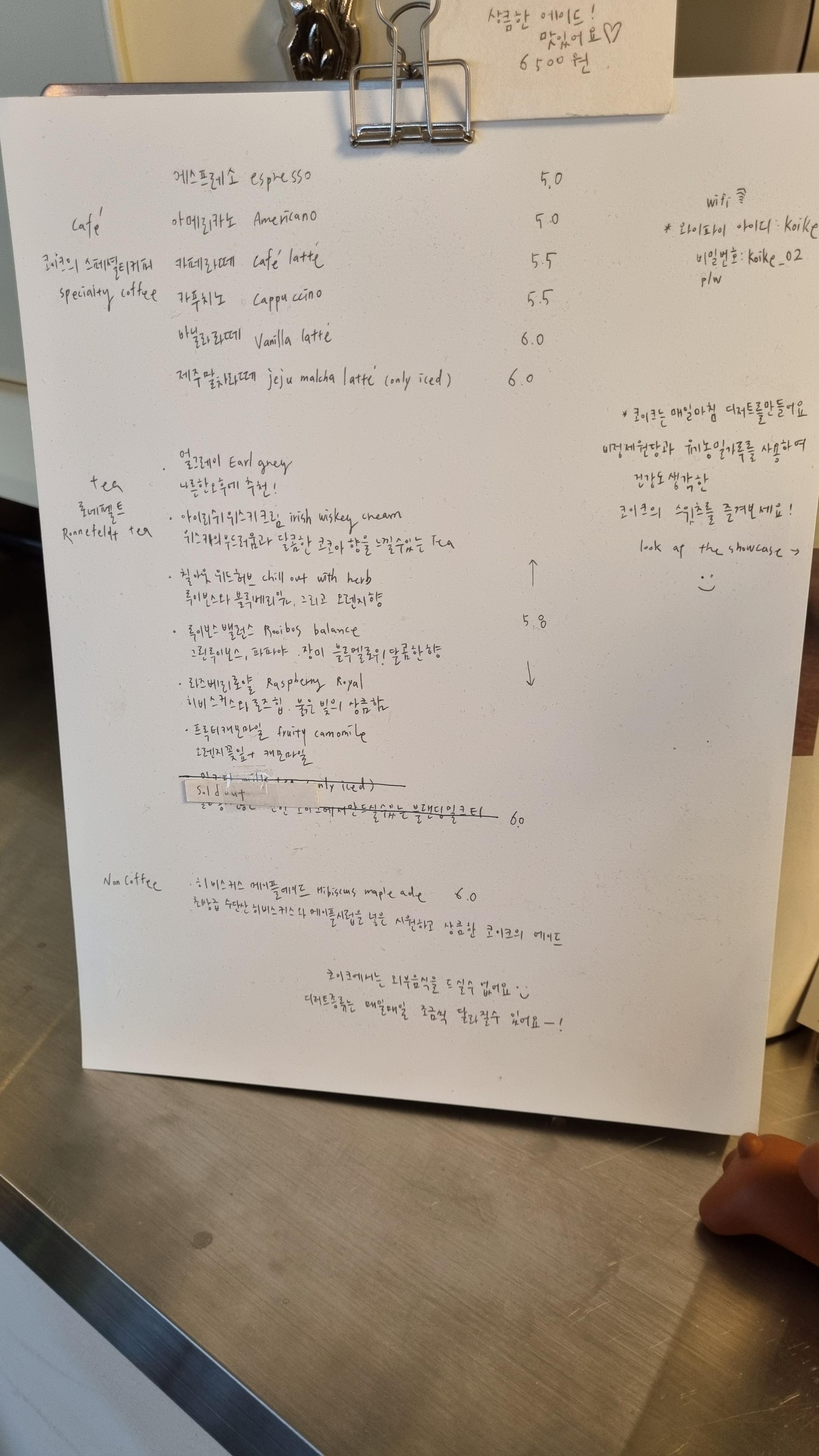 손으로 직접 작성한 메뉴판에, 디저트메뉴에 대한 내용과 음료메뉴가 적혀있다.