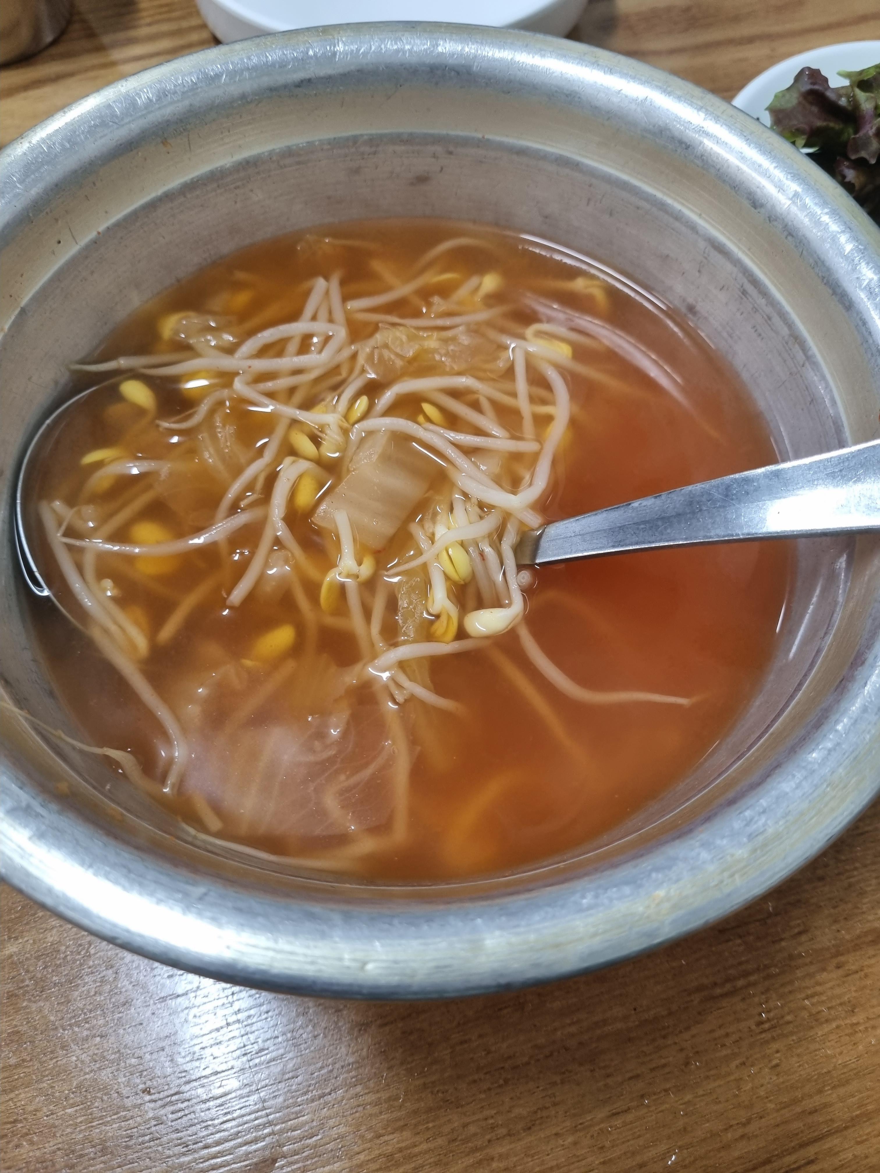 같이 나오는 반찬들도 종류가 여럿이다. 백김치와 무채, 콩나물국, 쌈채소 등등.