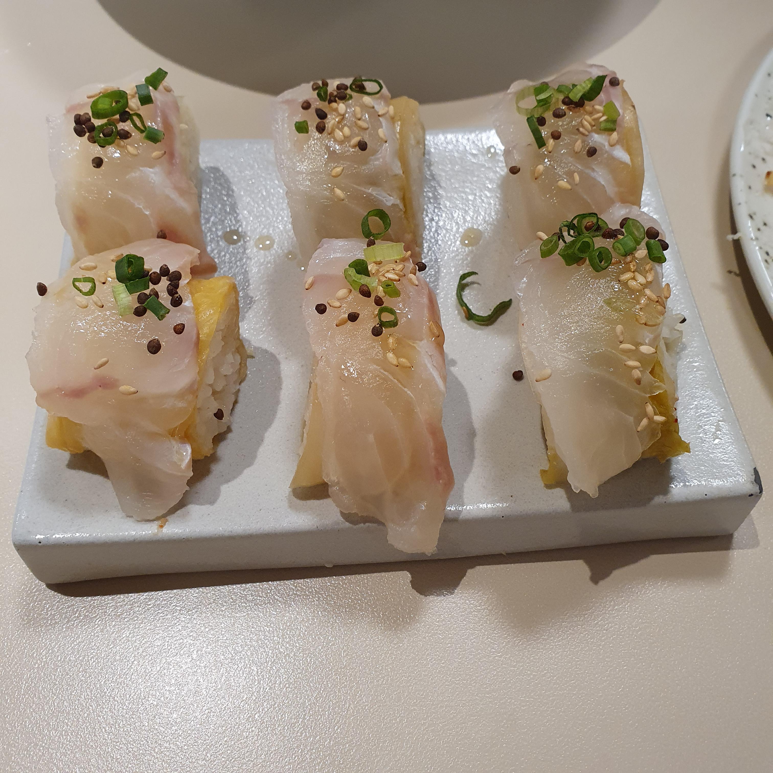 초밥밥에 묵은지를 말아서 김밥 롤처럼 만들고, 그 위에 제철회 올리면 끝!!!!
