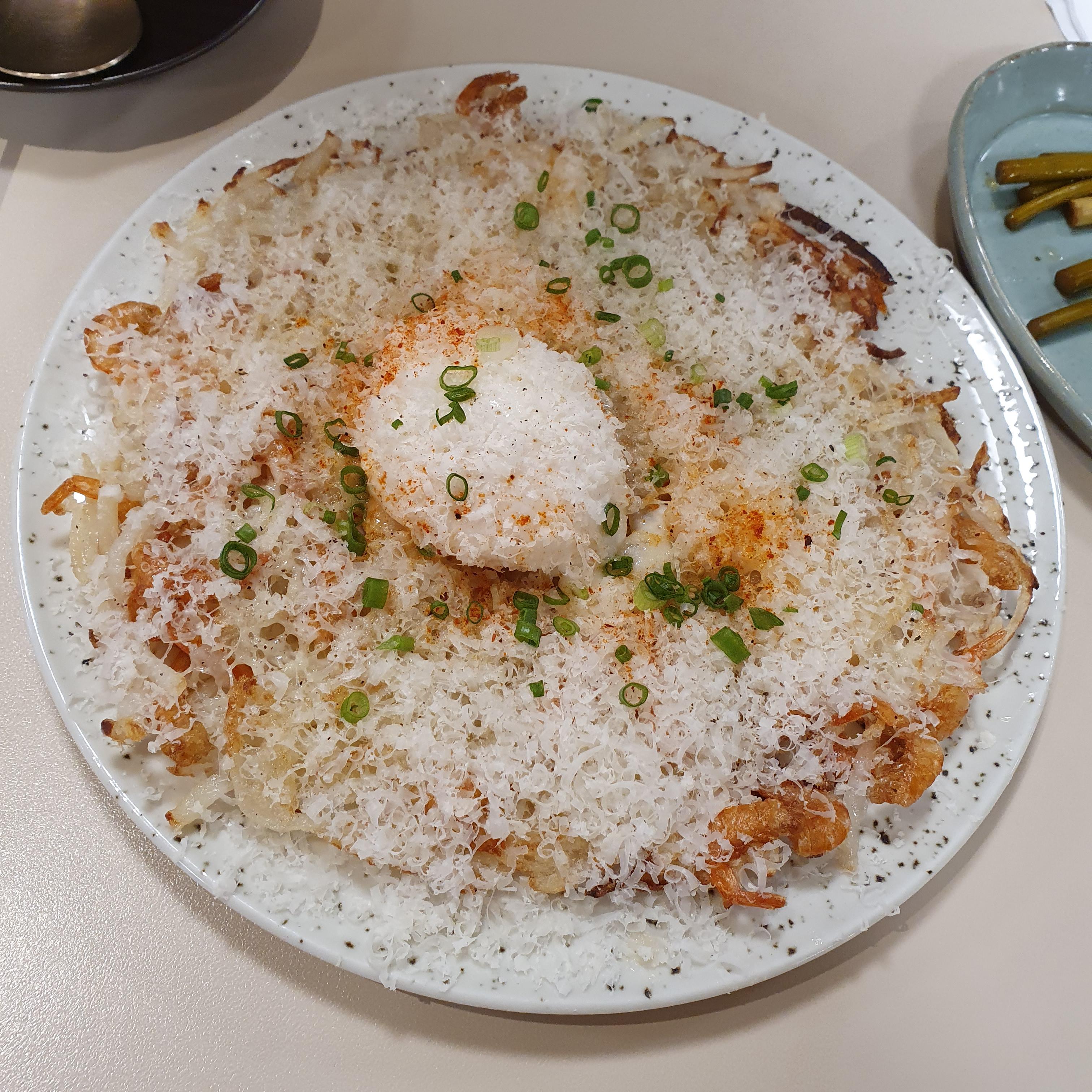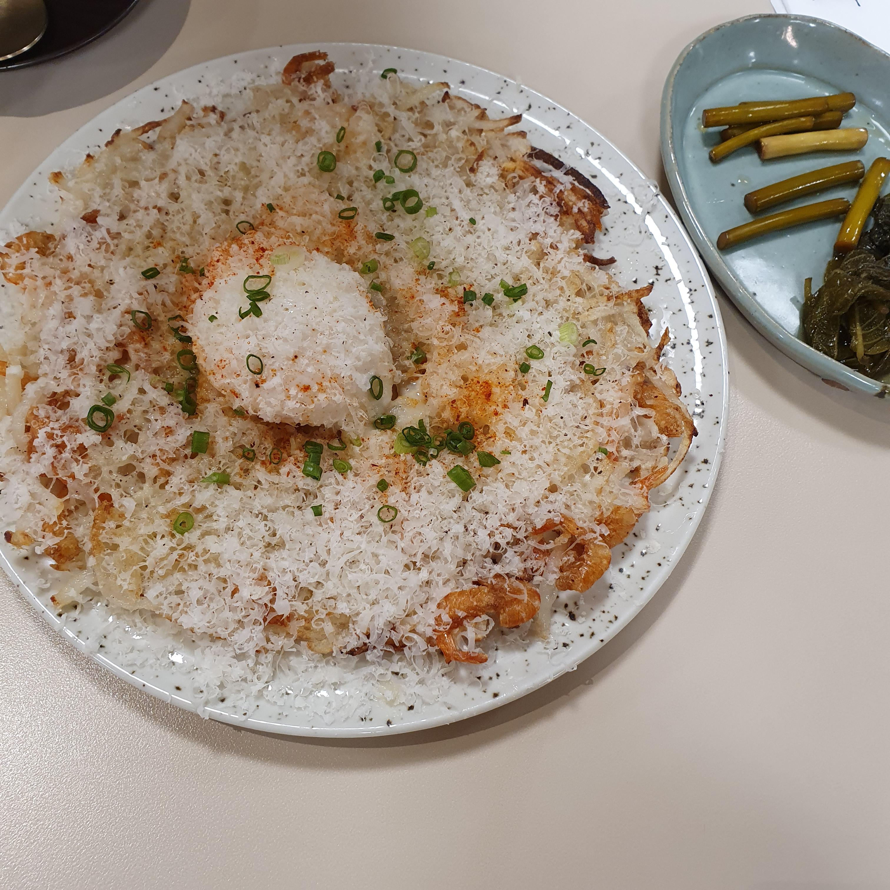 채썬 감자를 펼치고, 마른 새우를 토핑처럼 올려 구워냈다. 약간 해시브라운의 전 버전이라고 할까.