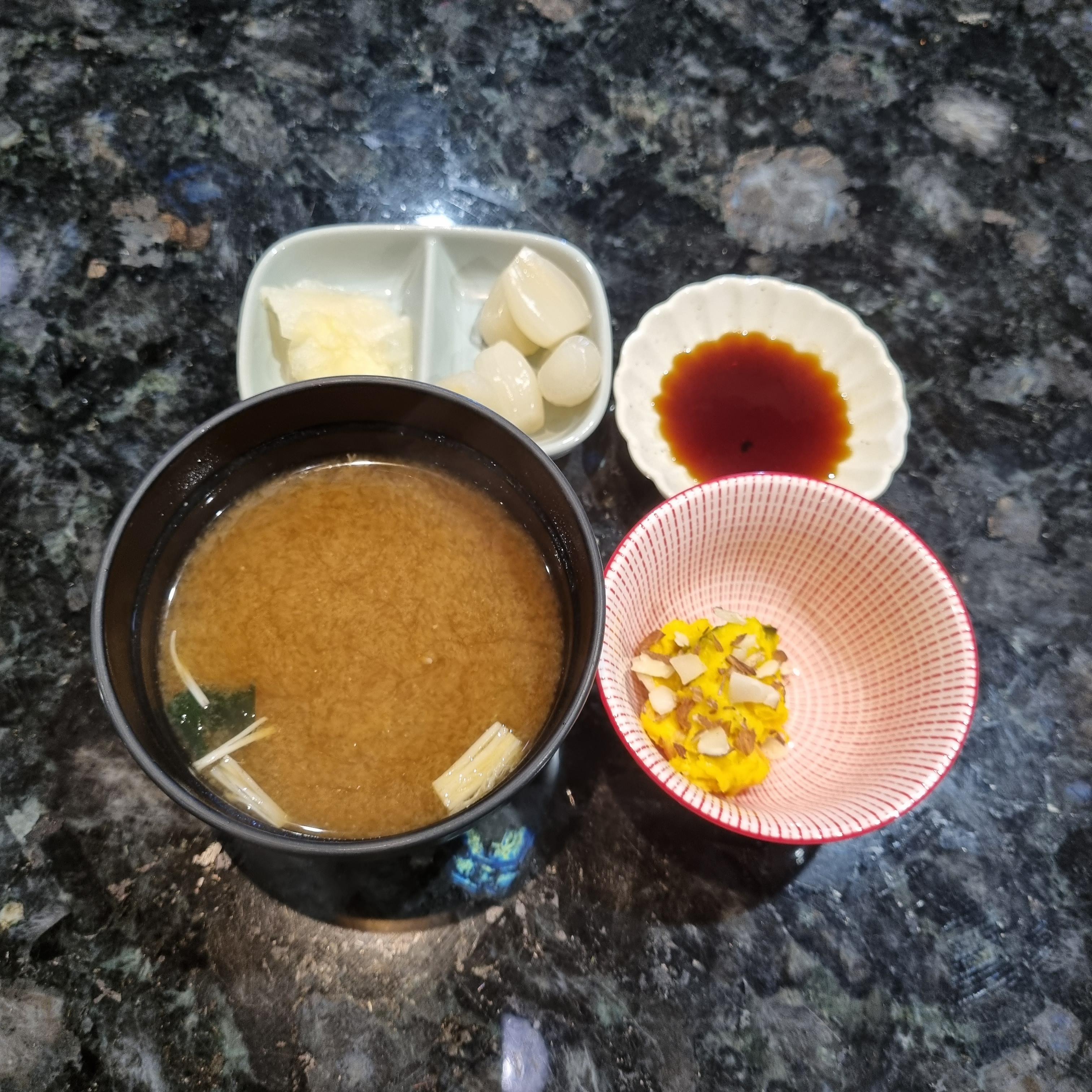 처음 제공되는 장국과 단호박샐러드, 간장, 락교, 생강초절임