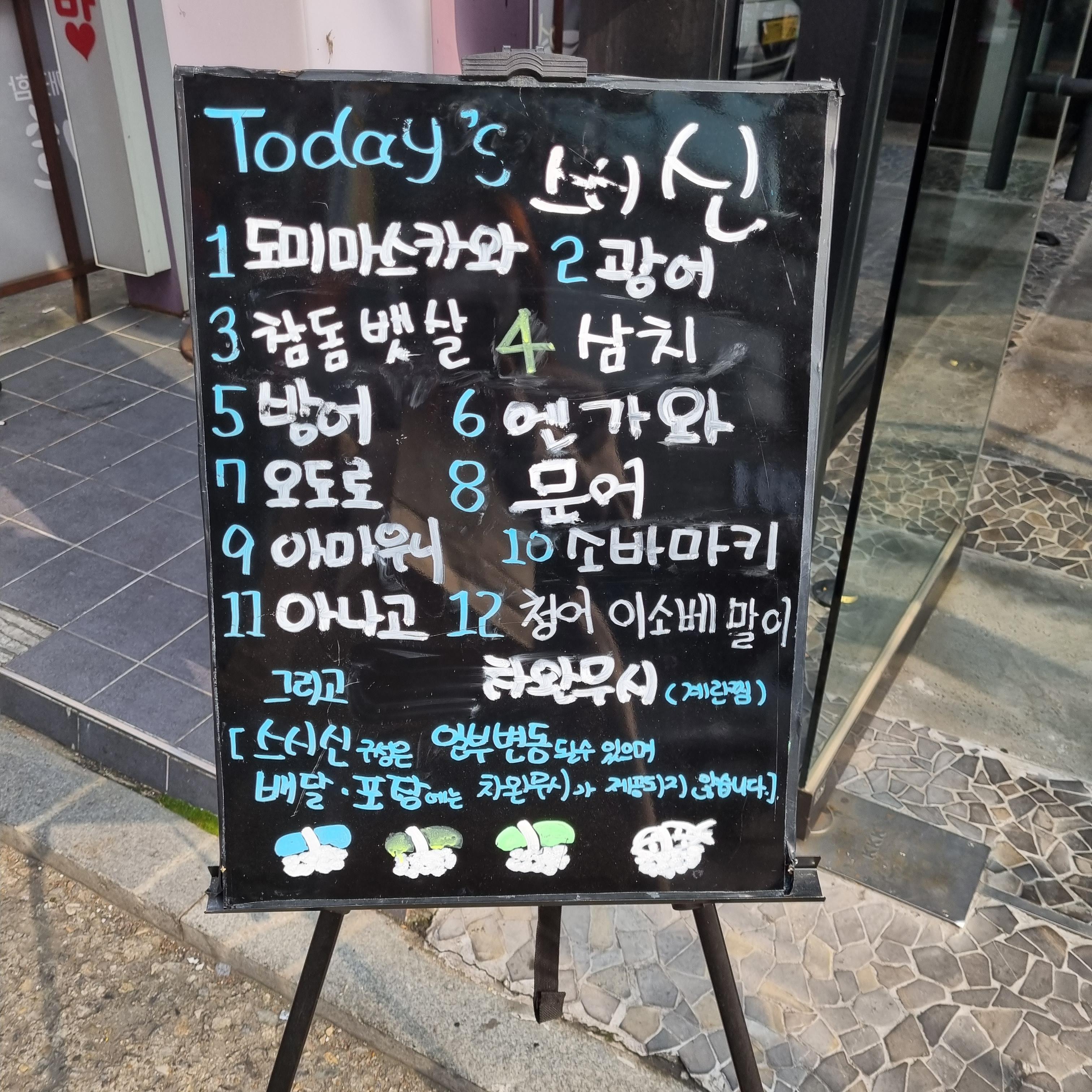 스시신의 구성은 그날그날 바뀌어서 매장 밖에 오늘의 스시신메뉴가 블랙보드에 적혀있다.