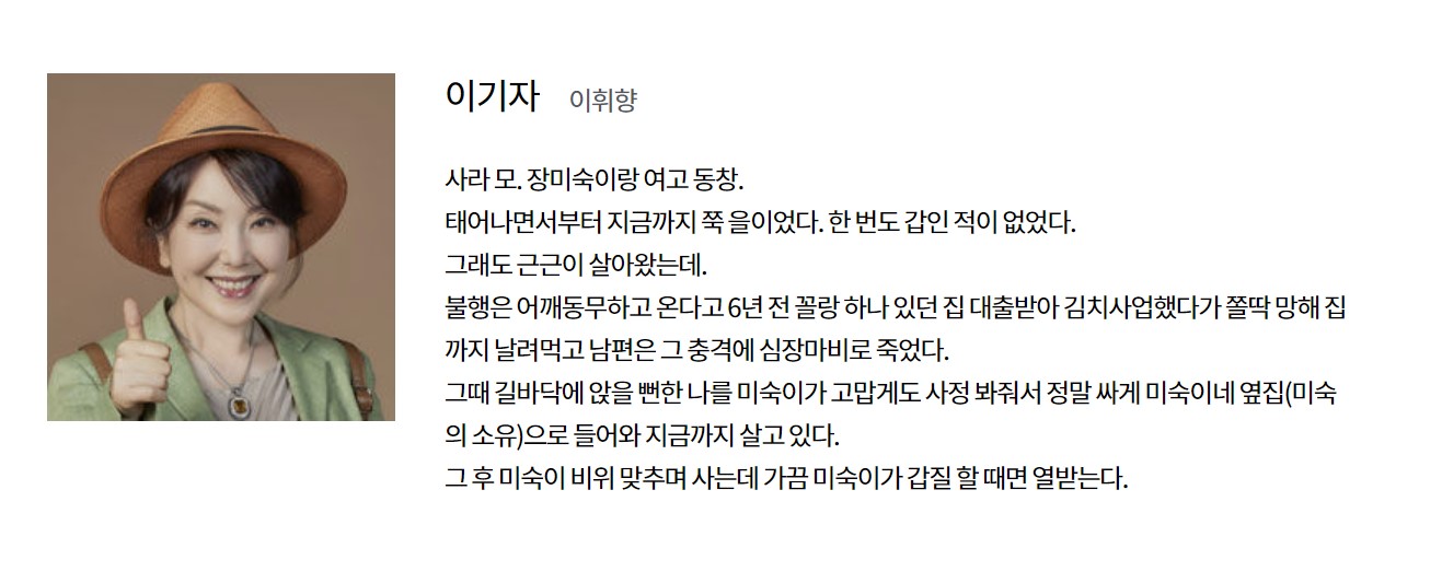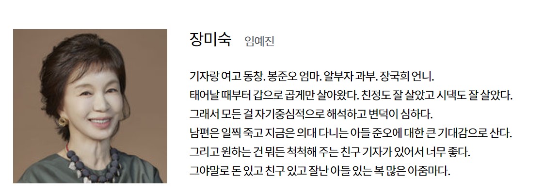 돈이 많은 남편이 일찍 죽고, 큰 집에서 살고 있으며 옆집은 친구 기자에게 월세도 안받고 빌려주고 있다.