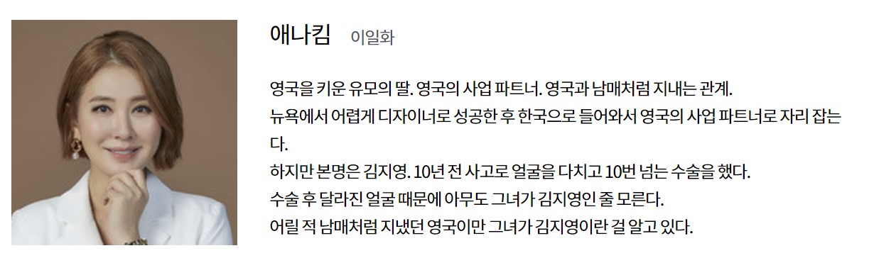 미국에서 사고로 성형수술을 해 얼굴이 모두 바뀌게 되어 박수철도 애나킴을 지영이라고 알아보지 못한다.
