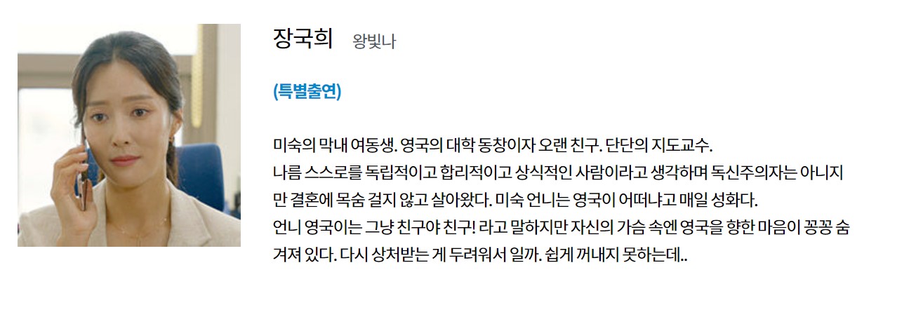 장미숙과 여고 동창생으로, 장미숙의 옆집에 살고 있다.