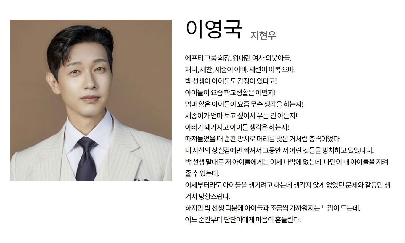 회장역을 맡아서 지현우가 목소리를 묵직하게 연기한다.