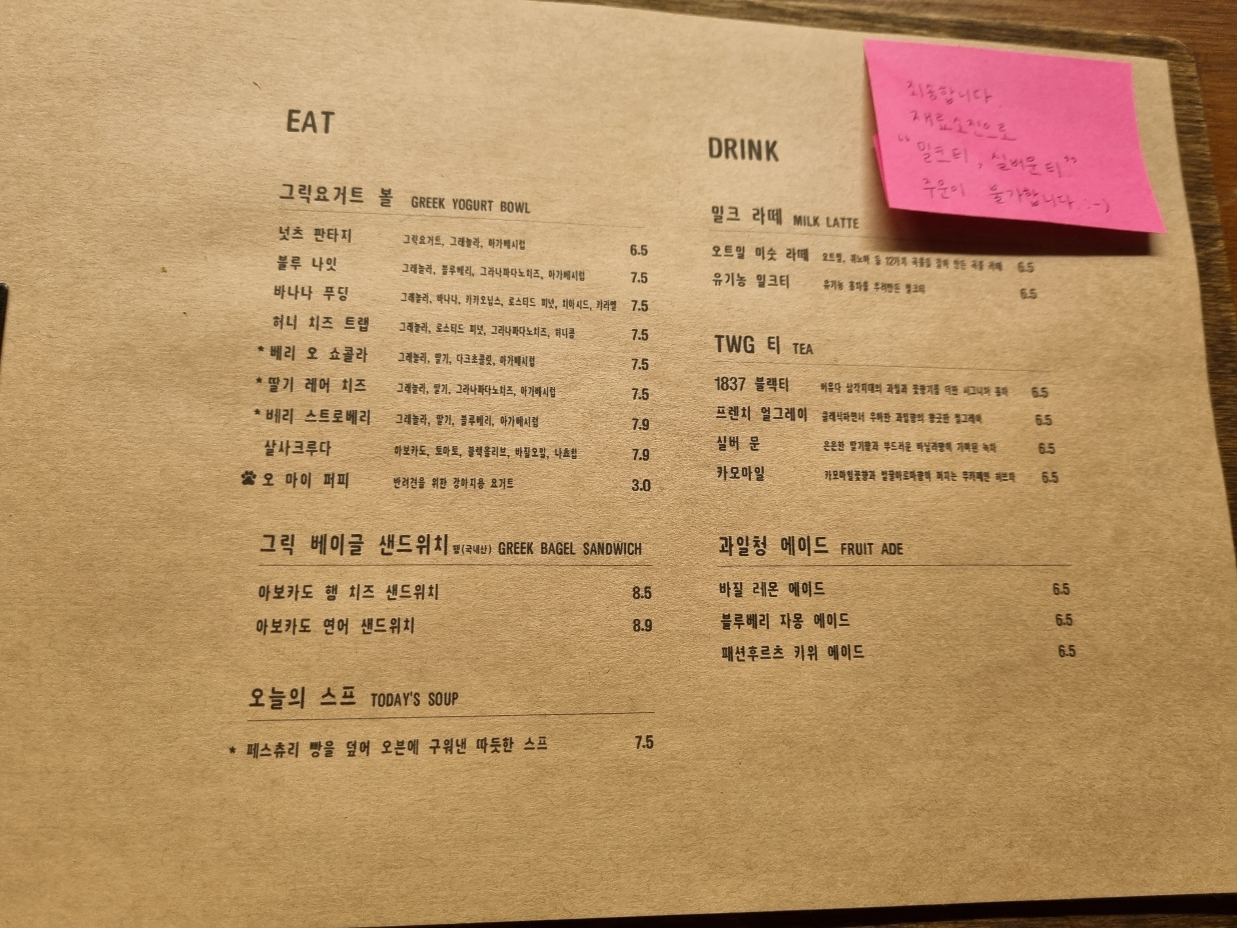 땡스오트에는 요거트를 기반으로 요거트볼과 그릭 베이글 샌드위치를 판매하고 있다. 요거트외에 음료류도 있어서 일행들 중 요거트를 선호하지 않아도 같이 방문하기 좋은 카페다. 연남점 같은 경우에는 웨이팅이 엄청난데 안국점은 조금 더 커보이니 같이 방문하기도 편할 것 같다.