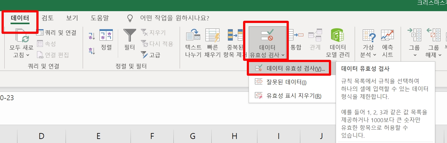 [데이터] -> [데이터 유효성 검사] -> [데이터 유효성 검사] 를 클릭한다.
