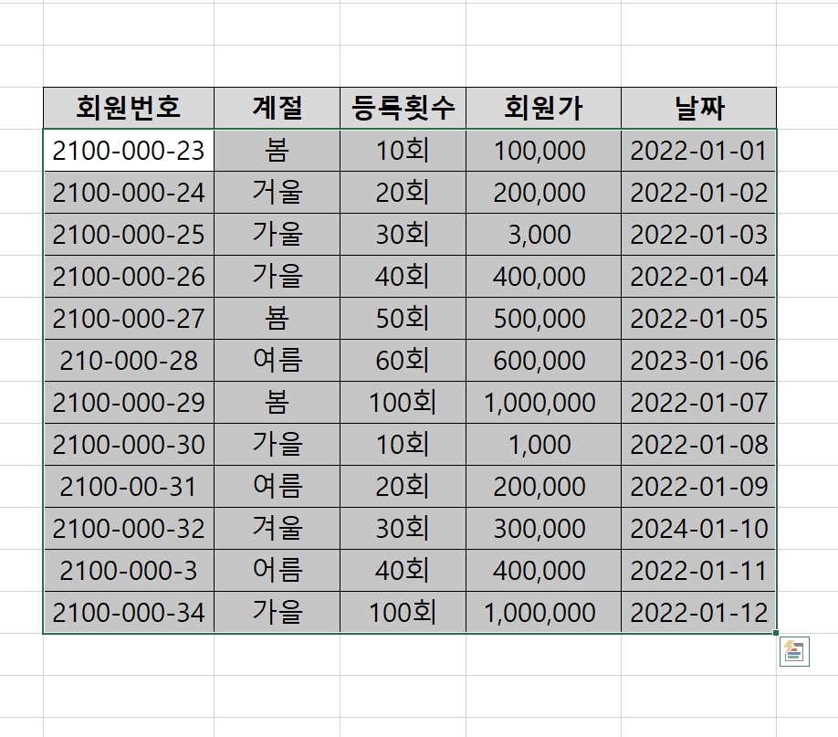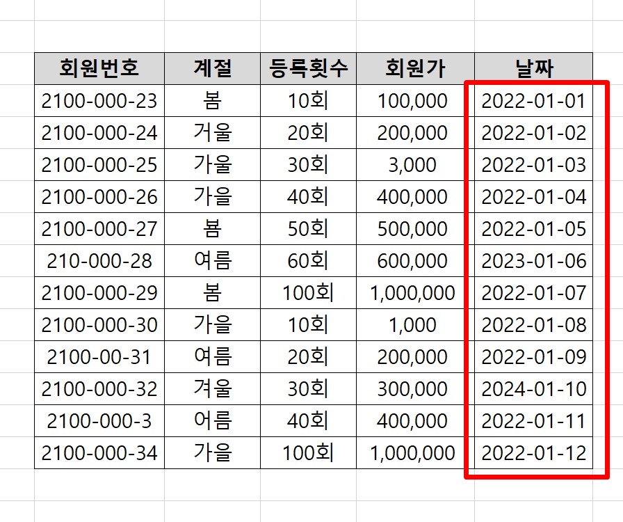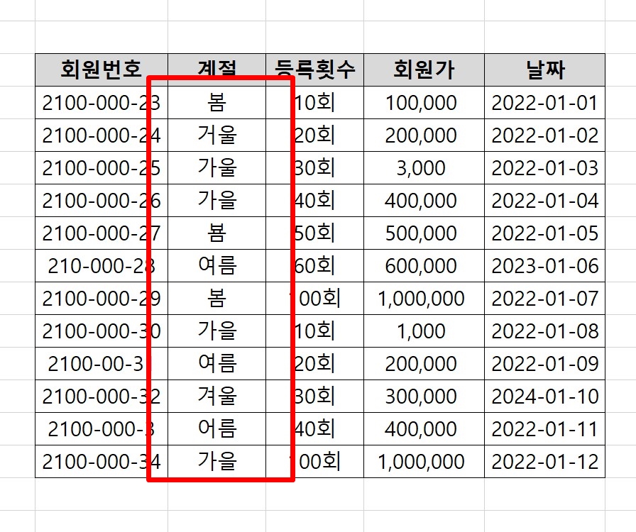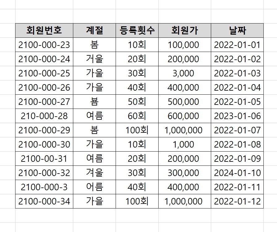4번째 열인 '회원가' 부분을, 10만원 이상인 조건으로 걸어두려고 한다.