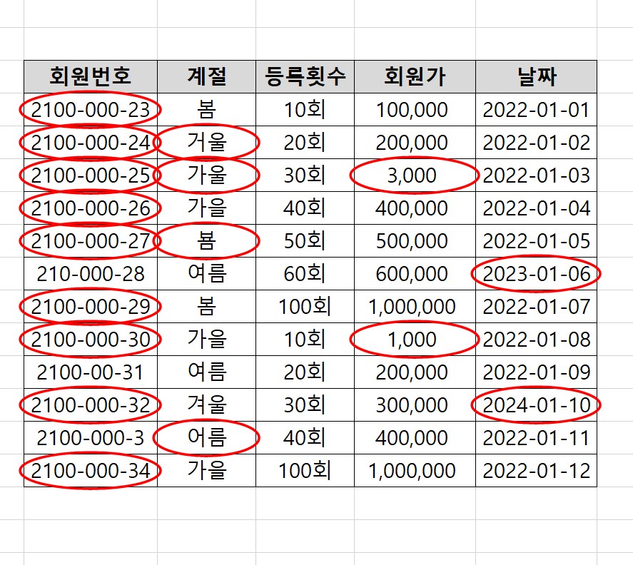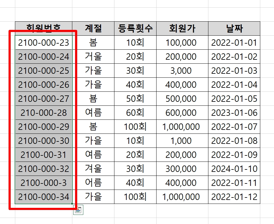 첫번째 회원번호 열에 입력되는 숫자의 자리수를 10자리까지로 제한하여 오류를 찾도록 하겠다.