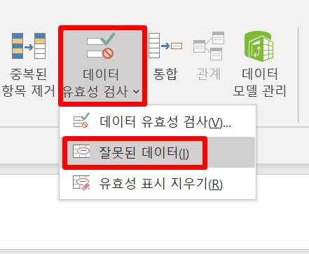 2. [데이터 유효성 검사] -> [잘못된 데이터]를 선택한다.