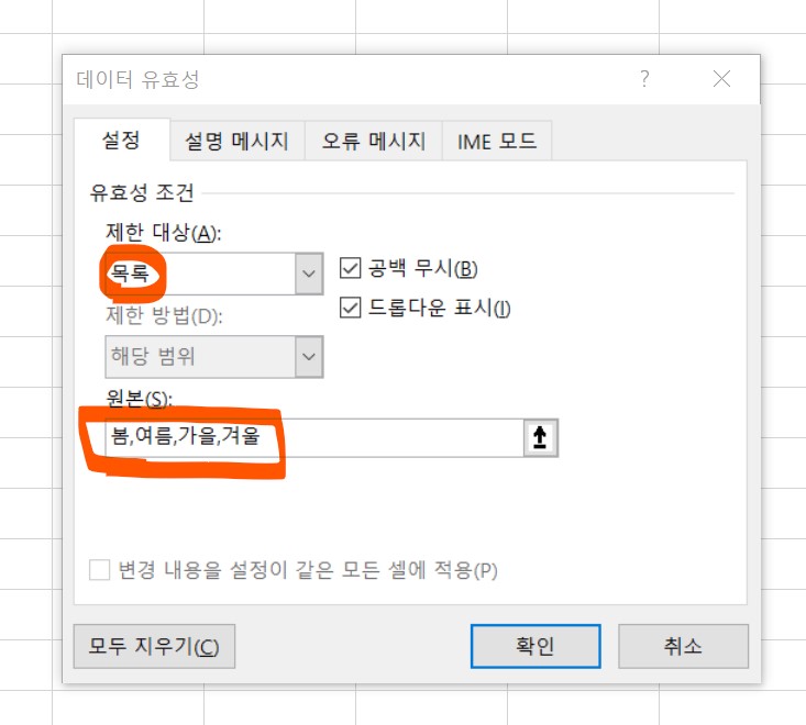 앞 선 포스팅에서는 데이터 유효성 검사를 이용해서, 지정된 틀 안에서만 입력이 가능하도록 지정하는 법을 알아보았다. 목록을 정해서 계절만 적을 수 있게 하거나, 정해진 범위의 날짜안에서만 날짜를 적을 수 있게 하거나 하는 식이었다.
