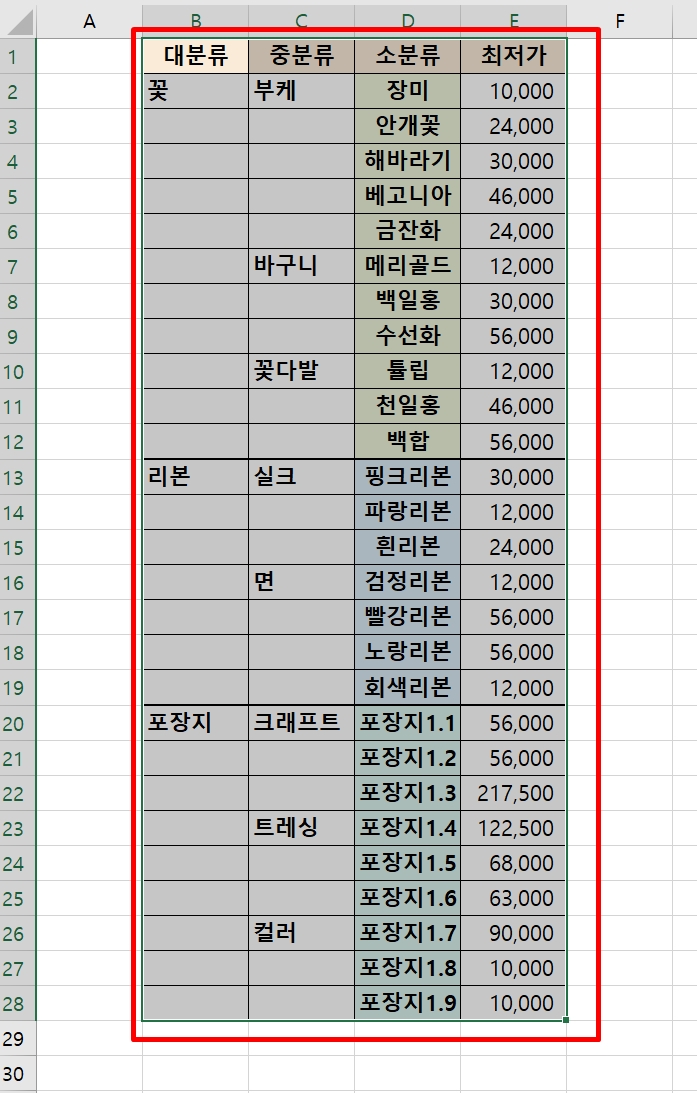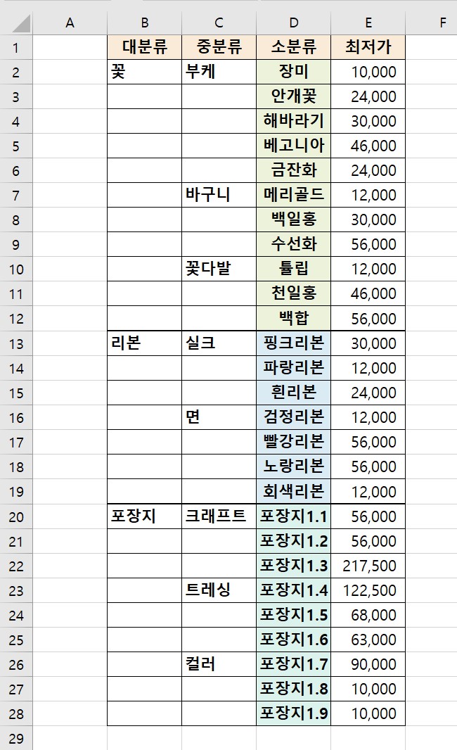 이번 포스팅에서는 대분류, 중분류, 소분류에 따라 데이터가 나뉘어진 자료를 가지고 선버스트 차트를 만들어보려고 한다.
