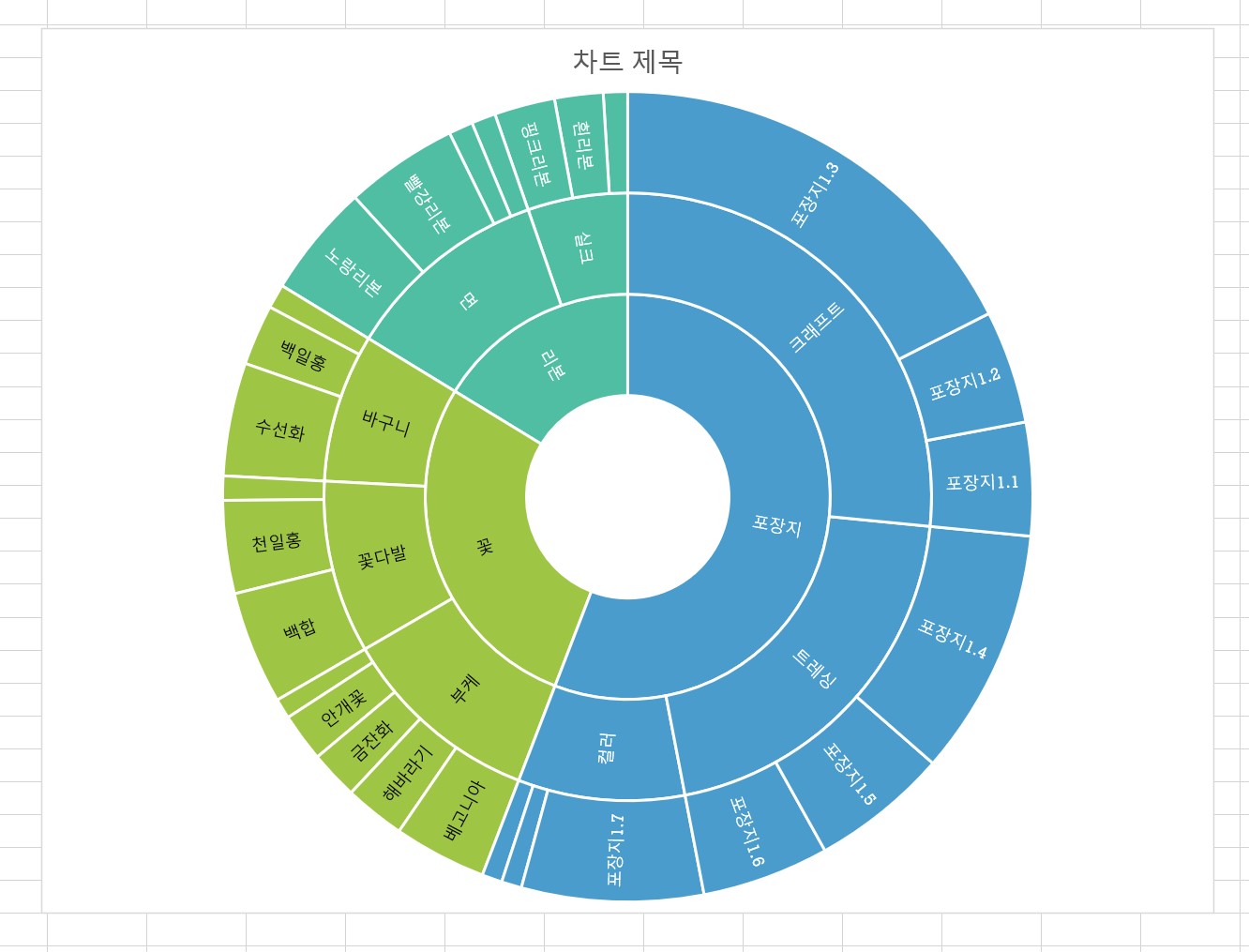 선버스트차트는 데이터가 대분류, 중분류, 소분류와 같이 계층을 나타낼 때 사용하면 좋다.