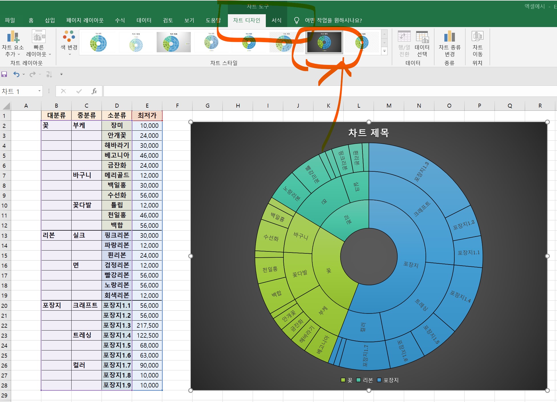 2. 선버스트 차트의 스타일을 변경하는 방법에 대해 알아보겠다.