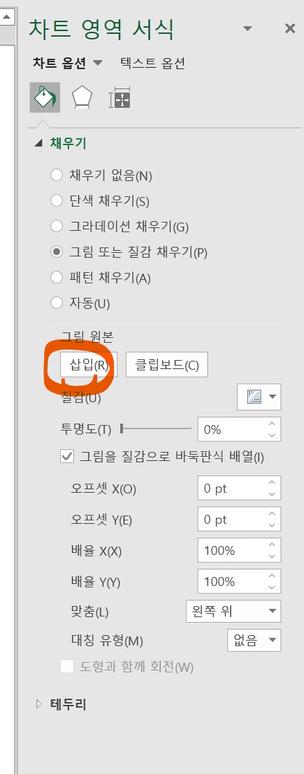 9. [차트 영역 서식]에서 [그림 원본] 의 [삽입]을 클릭한다.
